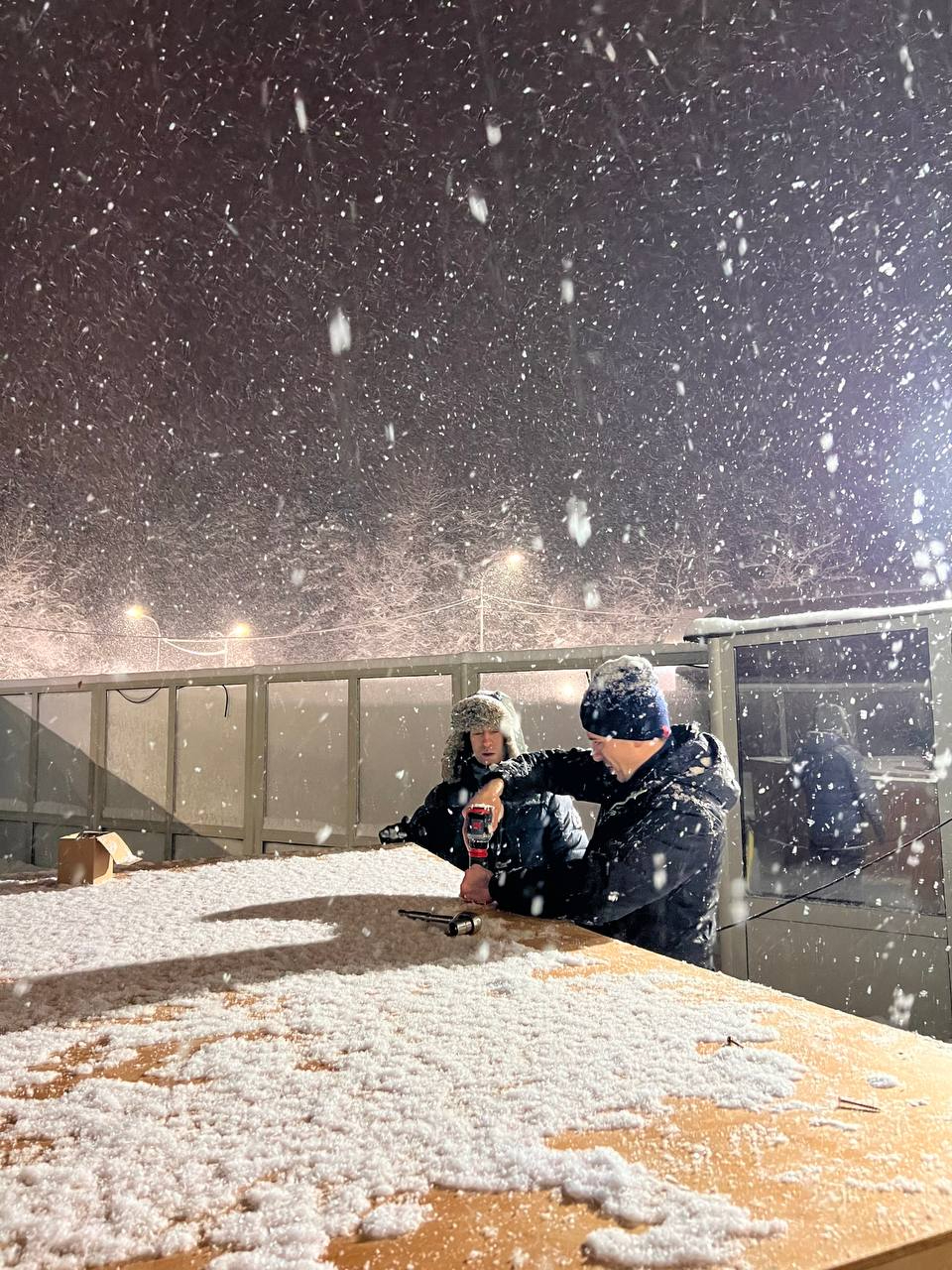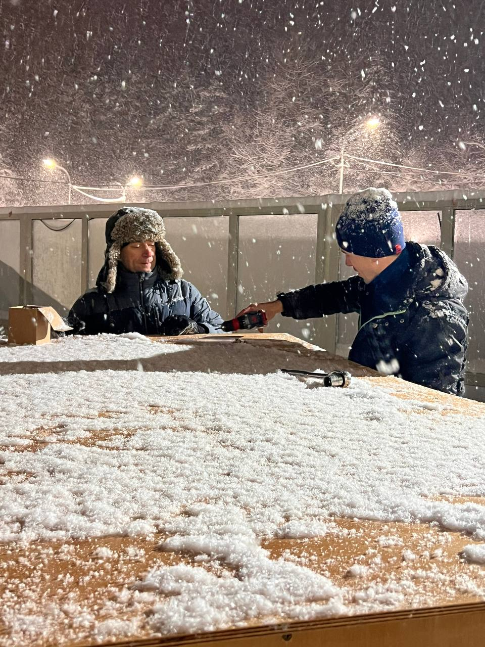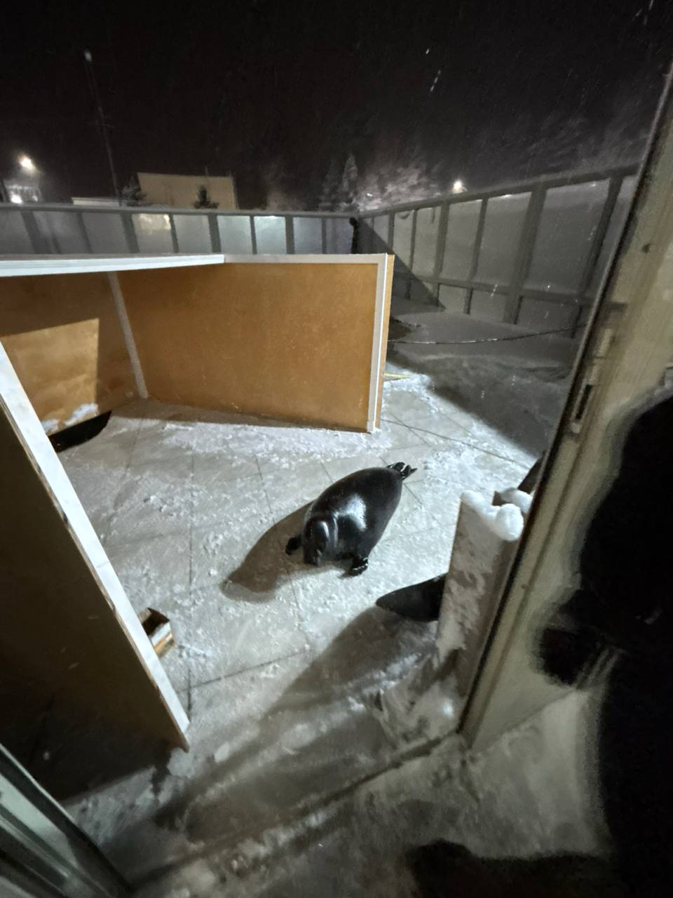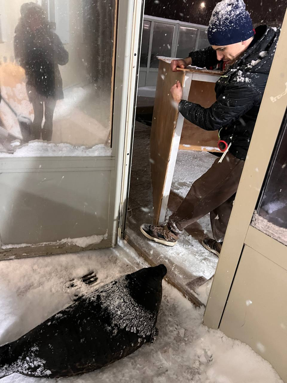 Судя по опубликованным в сообществе "Спасение тюленей 699-23-99" во "ВКонтакте" кадрам, монтировать домик приходилось в условиях снегопада и пристального контроля со стороны одариваемых. Шлиссик даже выбрался на смежную с вольером территорию, исследовал состояние снега и оставленного рабочего инвентаря, а после - недовольно нафырчал, не найдя в очередной емкости угощений.