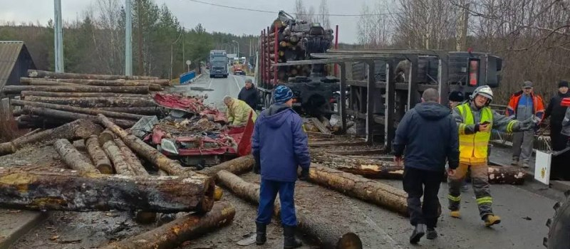 Полуприцеп с бревнами опрокинулся на легковой автомобиль по дороге на Петрозаводск