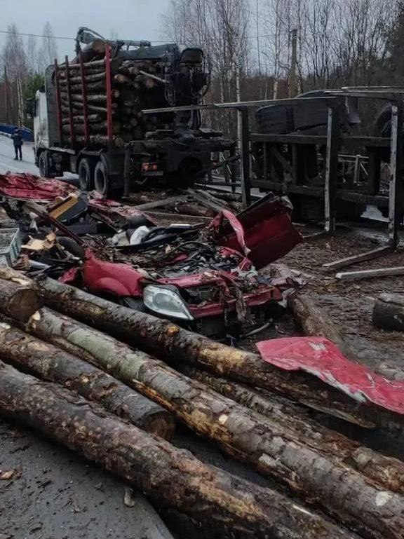 На трассе Санкт-Петербург – Петрозаводск утром 18 декабря произошла страшная авария. Около 10:00 45-летний водитель лесовоза не справился с управлением. В конце концов полуприцеп с бревнами вынесло на полосу встречного движения, и он перевернулся на легковой автомобиль Lada Largus.