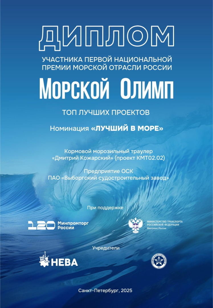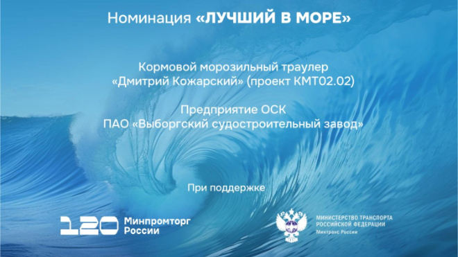 Траулер "Дмитрий Кожарский", построенный на Выборгском судостроительном заводе ОСК в 2023 году, вошёл в топ лучших судов России по версии Первой национальной премии морской отрасли "Морской Олимп" в номинации "Лучший в море". Судно предназначено для Группы Компаний "ФОР" и в настоящее время успешно работает на промысле в Северной Атлантике.