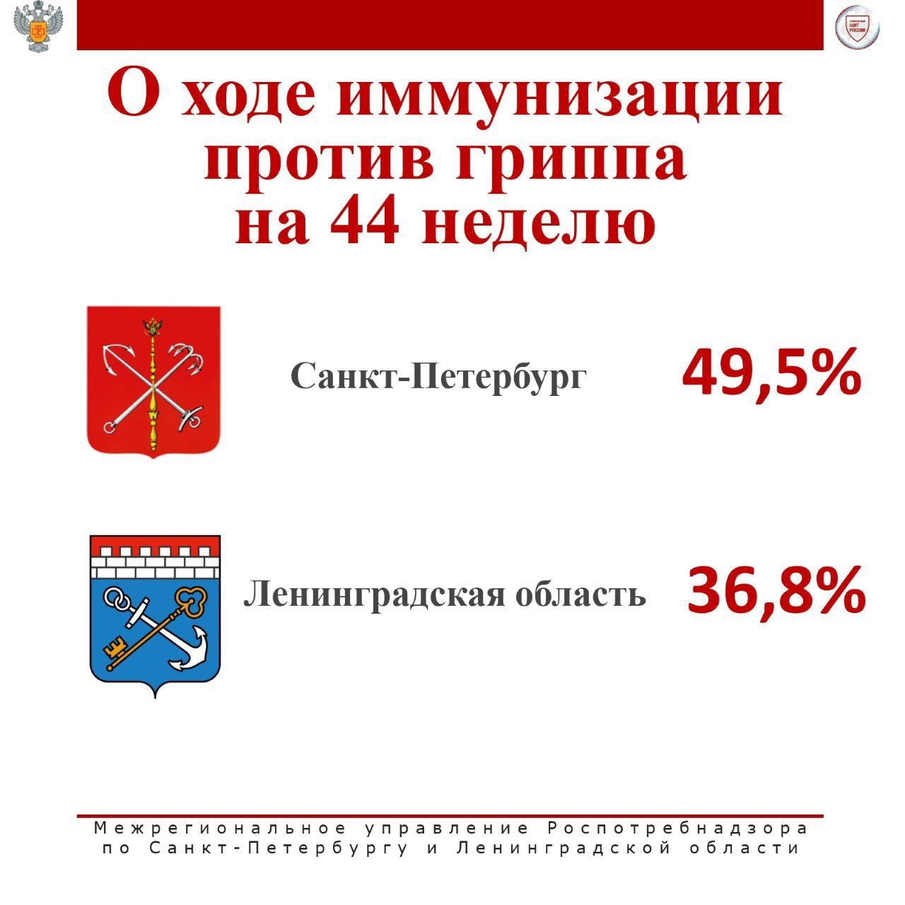 По данным на 4 ноября, в Санкт-Петербурге были привиты 2 771 388 человек - 49,5% охвата населения. Лидерами по вакцинации от гриппа стали Красносельский, Пушкинский, Выборгский, Курортный и Калининский районы.
