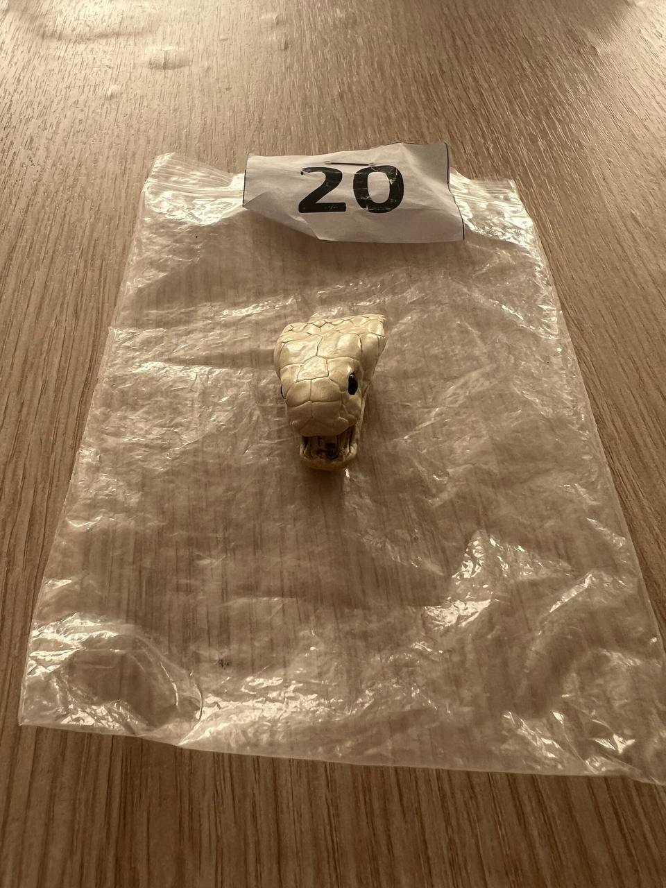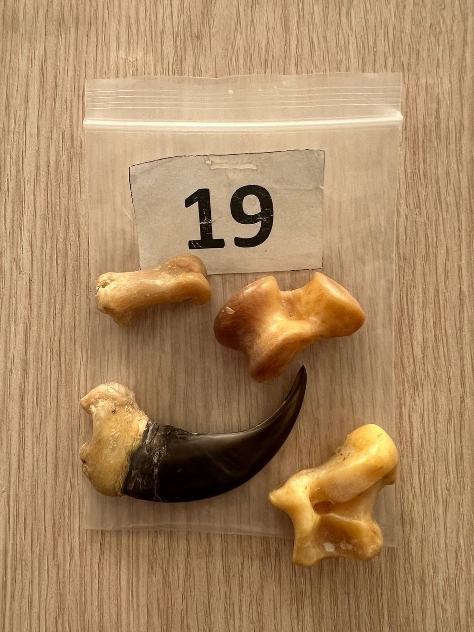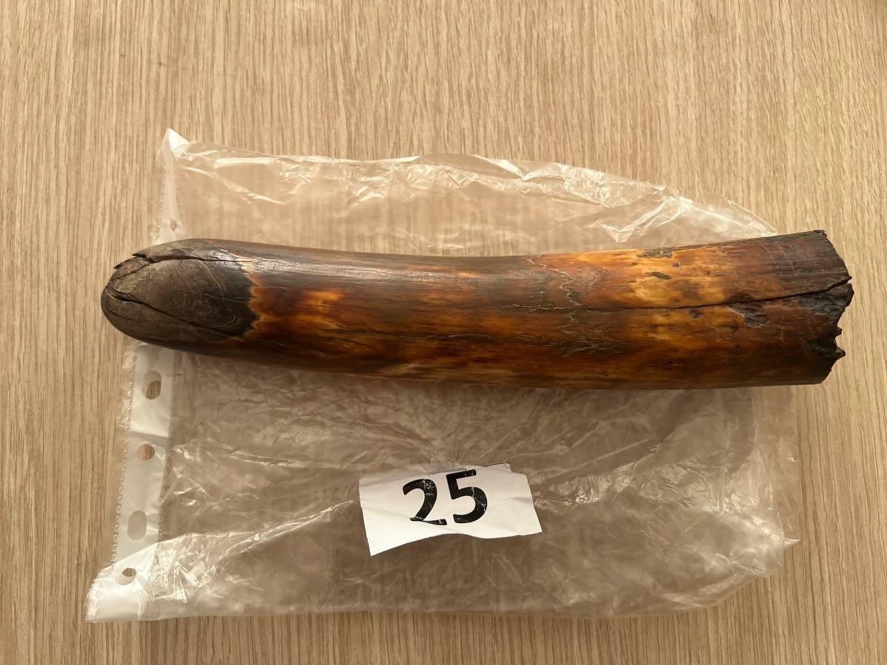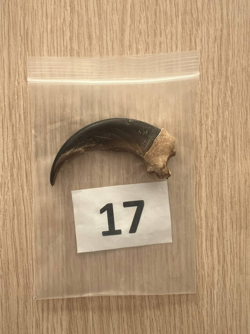 Дальнейшая проверка рюкзака, двух чемоданов и карманов пассажира показала наличие 67 дериватов разных видов животных: клыков, когтей, частей рогов, фрагментов бивней мамонта и высушенной головы змеи. Экспертиза установила, что некоторые экземпляры подпадают под действие Конвенции СИТЕС и принадлежат видам орлан, сайгак, кашалот и леопард, остальные — части других животных и останки вымерших видов.