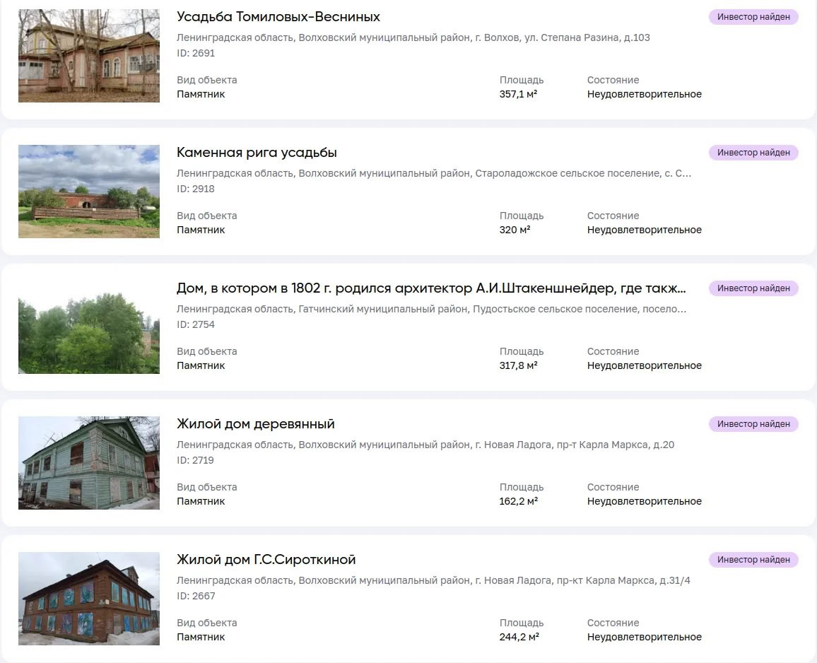 Пять объектов культурного наследия регионального значения из Ленинградской области, нуждающиеся в реставрации, нашли инвесторов. Вторую жизнь обретут усадьба Томиловых-Весниных в Волхове, каменная рига усадьбы в Старой Ладоге, дом архитектора Штакеншнейдера в поселке Мыза-Ивановка, а также два дома в Новой Ладоге.