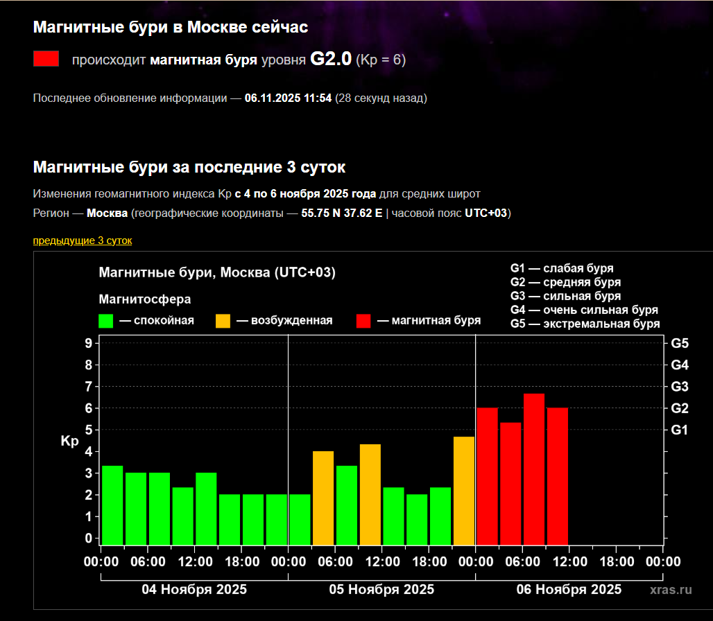 Ночью в четверг, 6 ноября, по московскому времени на Земле начались магнитные бури планетарного масштаба. Геомагнитный индекс достиг уровня G2–G3, что соответствует средним и сильным возмущениям, пишет Лаборатория солнечной астрономии (ИКИ РАН и ИСЗФ СО РАН).