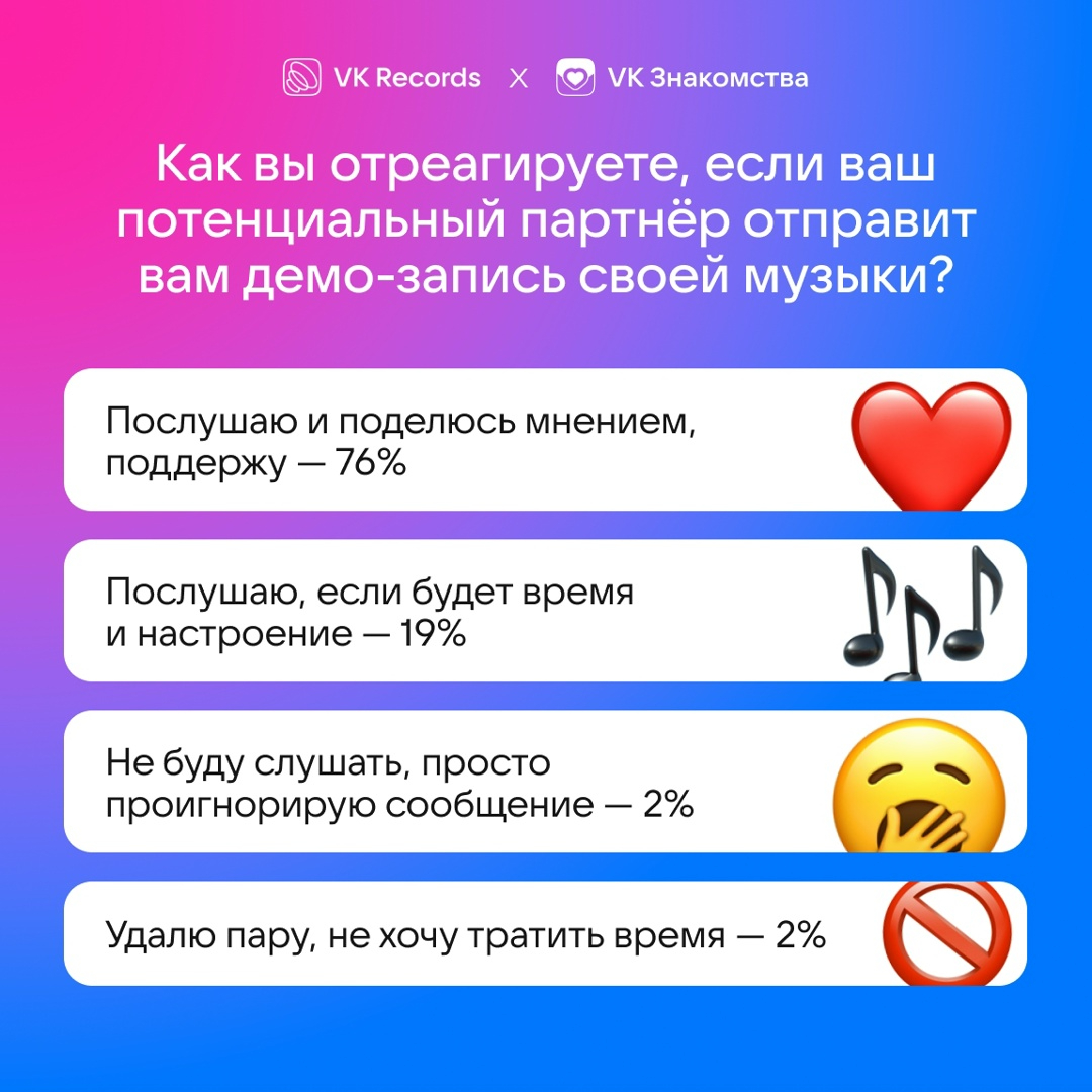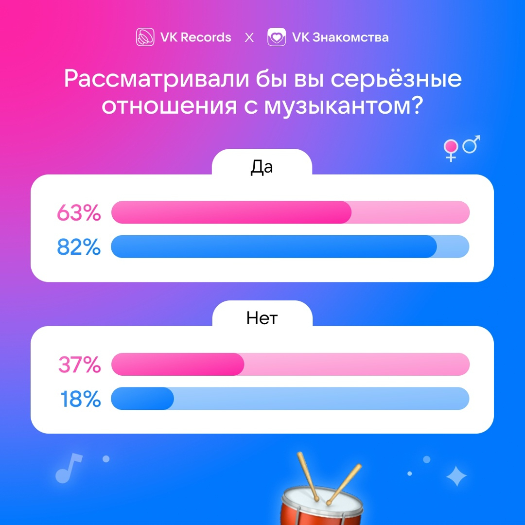 Несмотря на это, отношение к музыкантам в сервисах для знакомств в целом остается позитивным: многие готовы общаться, слушать треки и даже ходить на концерты потенциальных партнеров. Лишь малая часть опрошенных заявила, что не будут тратить время на музыканта.