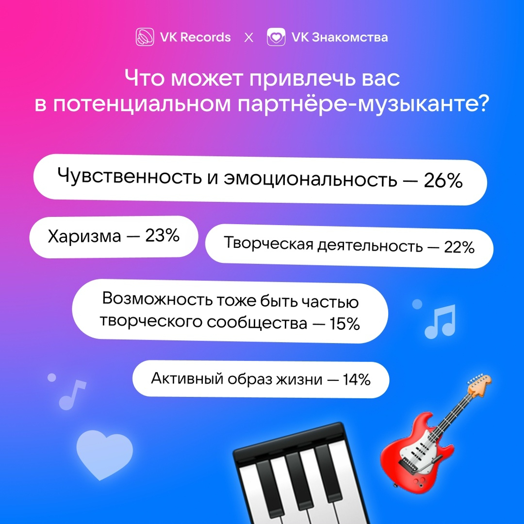 Аналитики дейтинг-сервиса VK Знакомства и музыкального лейбла VK Records изучили, как россияне относятся к музыкантам в качестве потенциального партнера и собеседника. Результаты исследования оказались в распоряжении 47 канала во вторник, 28 апреля.
