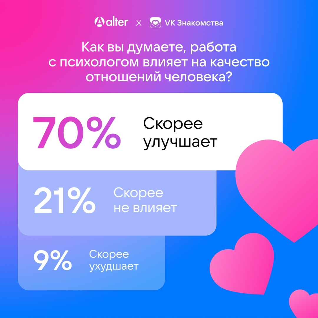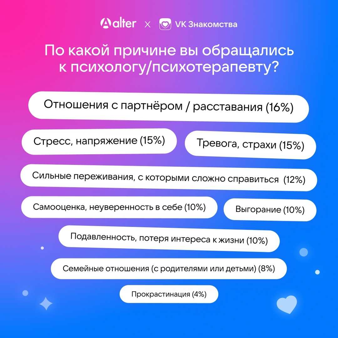 В ходе онлайн-опроса, проведённого российским сервисом знакомств VK Знакомства совместно с психологической платформой Alter, выяснилось, как россияне относятся к психотерапии и как посещение психолога влияет на романтические отношения. Исследование охватило 2 513 человек из разных регионов страны.