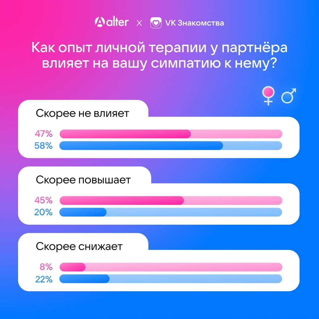 Большинство участников опроса (71%) считают, что потенциальному партнёру не обязательно иметь опыт работы с психологом. Однако для 35% женщин и 18% мужчин это принципиально важно. 45% женщин воспринимают опыт терапии у мужчины как фактор, повышающий его привлекательность, тогда как среди мужчин только 20% считают это преимуществом женщины, а 22% воспринимают такой опыт скорее как минус.