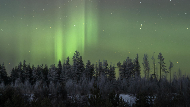 Северное сияние над заснеженным лесом запечатлели в Ленобласти