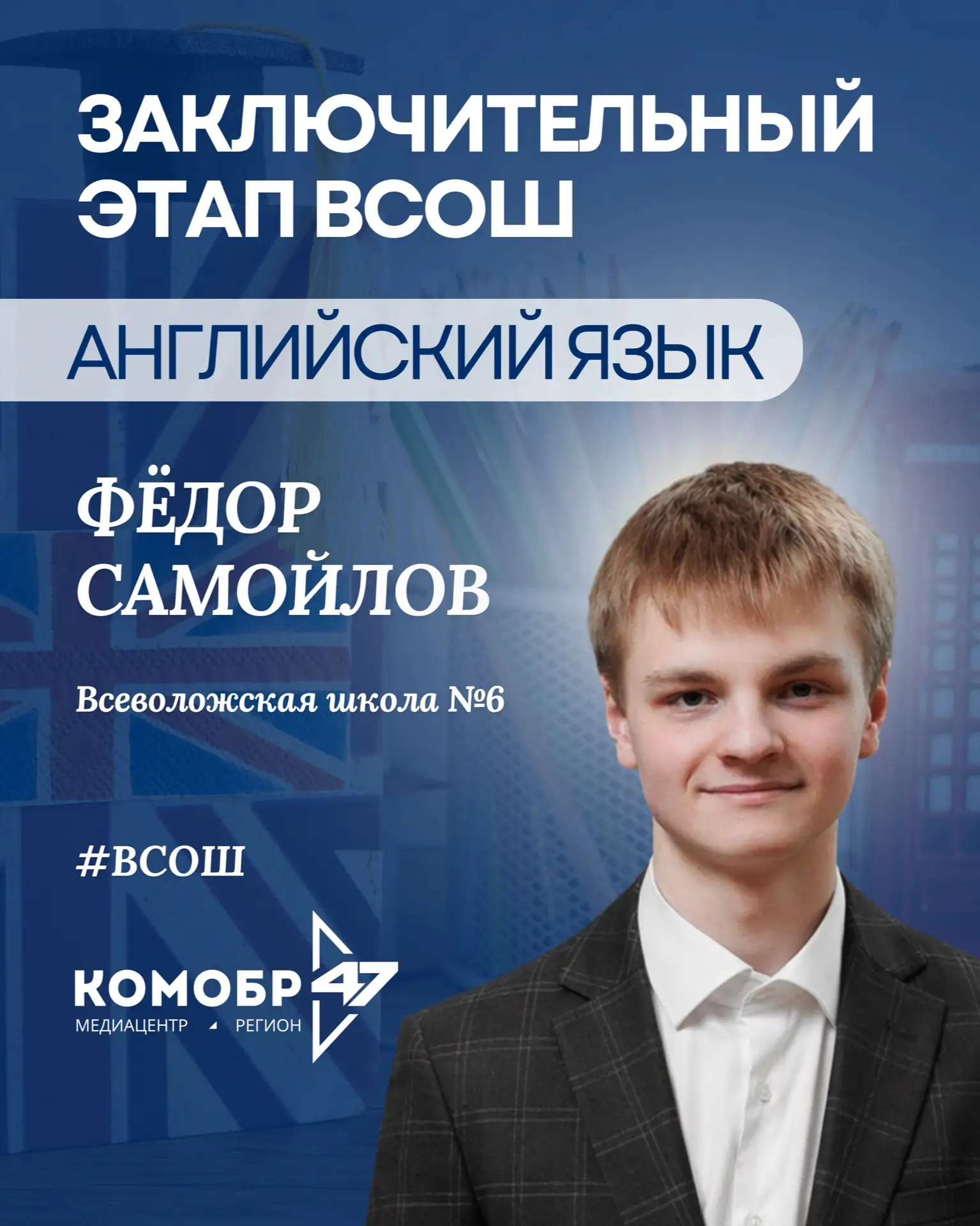 Федор Самойлов – ученик Всеволожской школы №6 – участвует в финале олимпиады по английскому языку. Его ожидает два тура. В письменной части юноше предстоит продемонстрировать свои знания грамматики и лексики, в устной – уровень владения разговорной речью и умение свободно выражать свои мысли.
