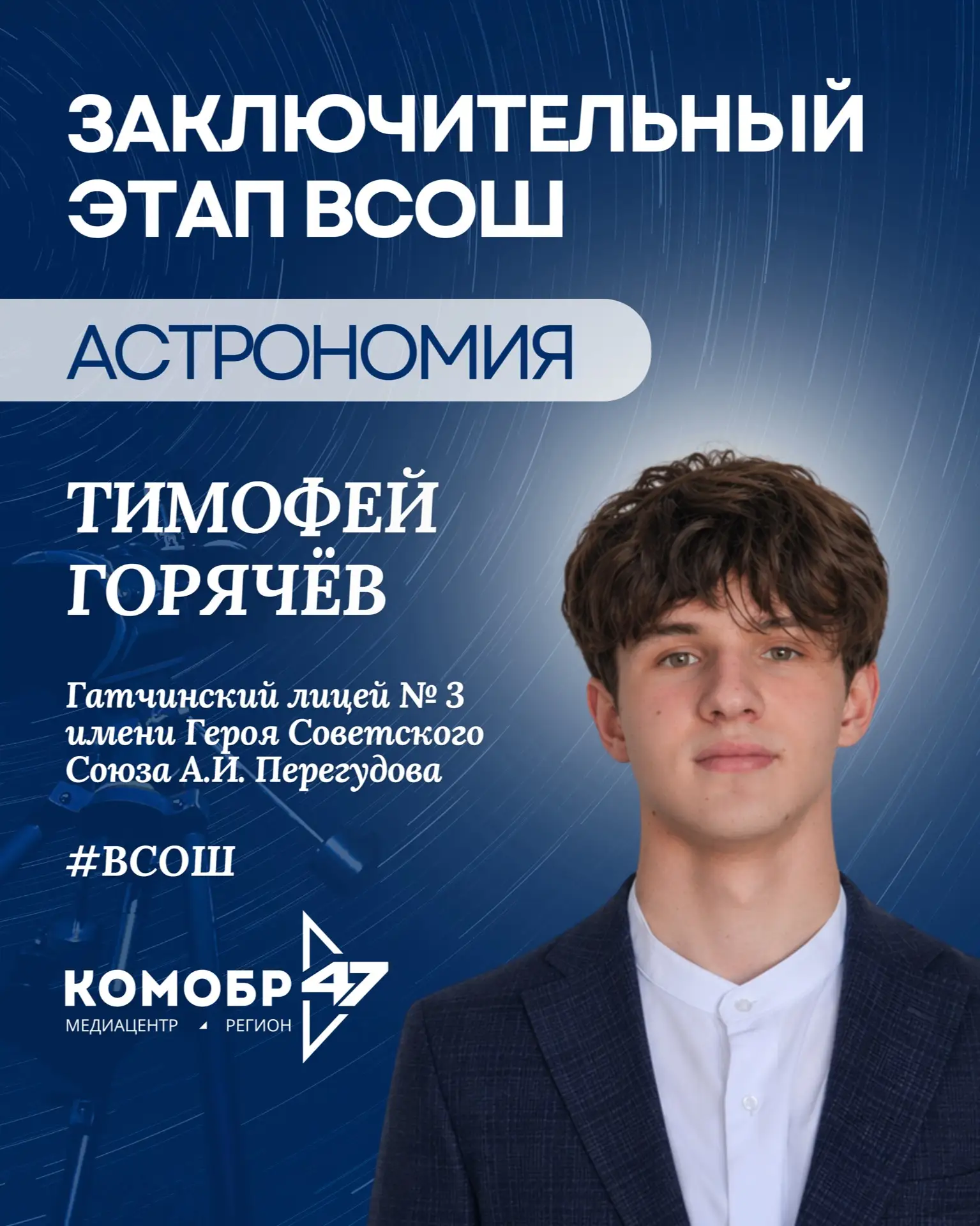 Тимофей Горячёв из Гатчинского лицея № 3 им. Героя Советского Союза А.И. Перегудова будет отстаивать честь Ленобласти в финале олимпиады по астрономии. Молодой человек должен будет решить теоретические и практические задачи.