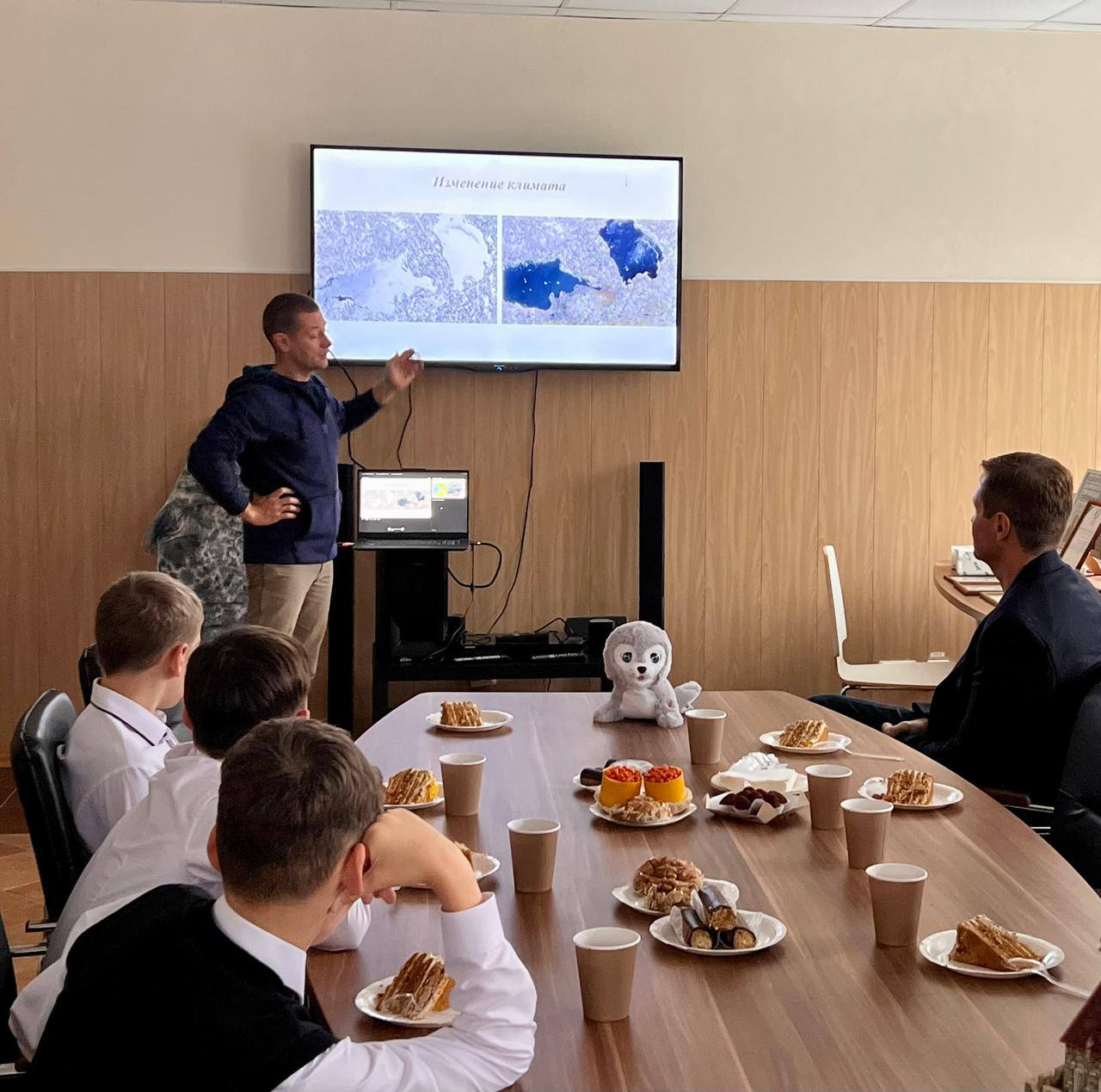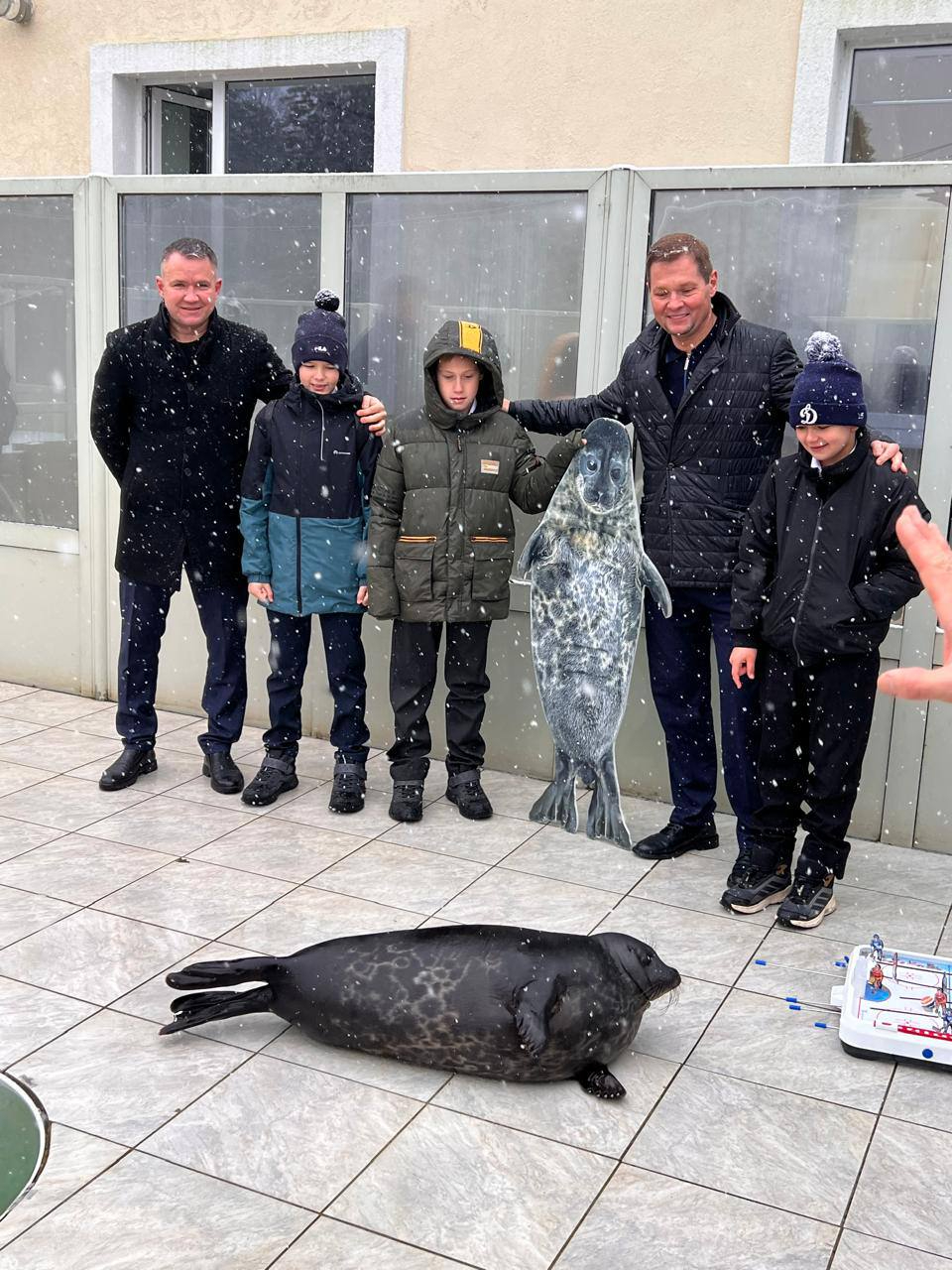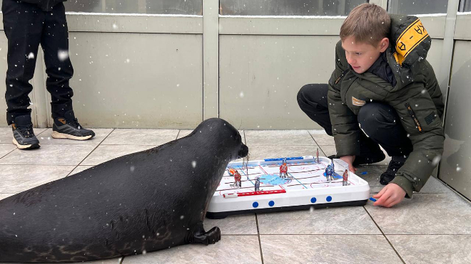К ластоногому в гости также пришли юные хоккеисты. Шлиссик проверил их умения, сыграв партию в настольный хоккей.
