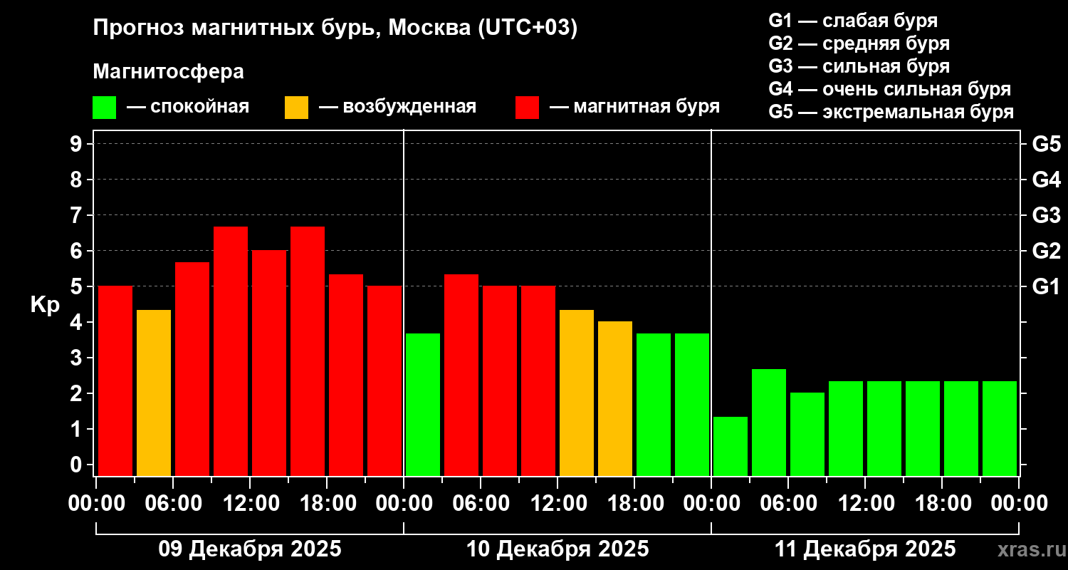 Согласно прогнозу на 24 часа, магнитные бури должны были начаться в ночь на вторник, 9 декабря, и продлиться до полуночи среды, 10 декабря. Возобновление возмущений прогнозировалось спустя несколько часов.