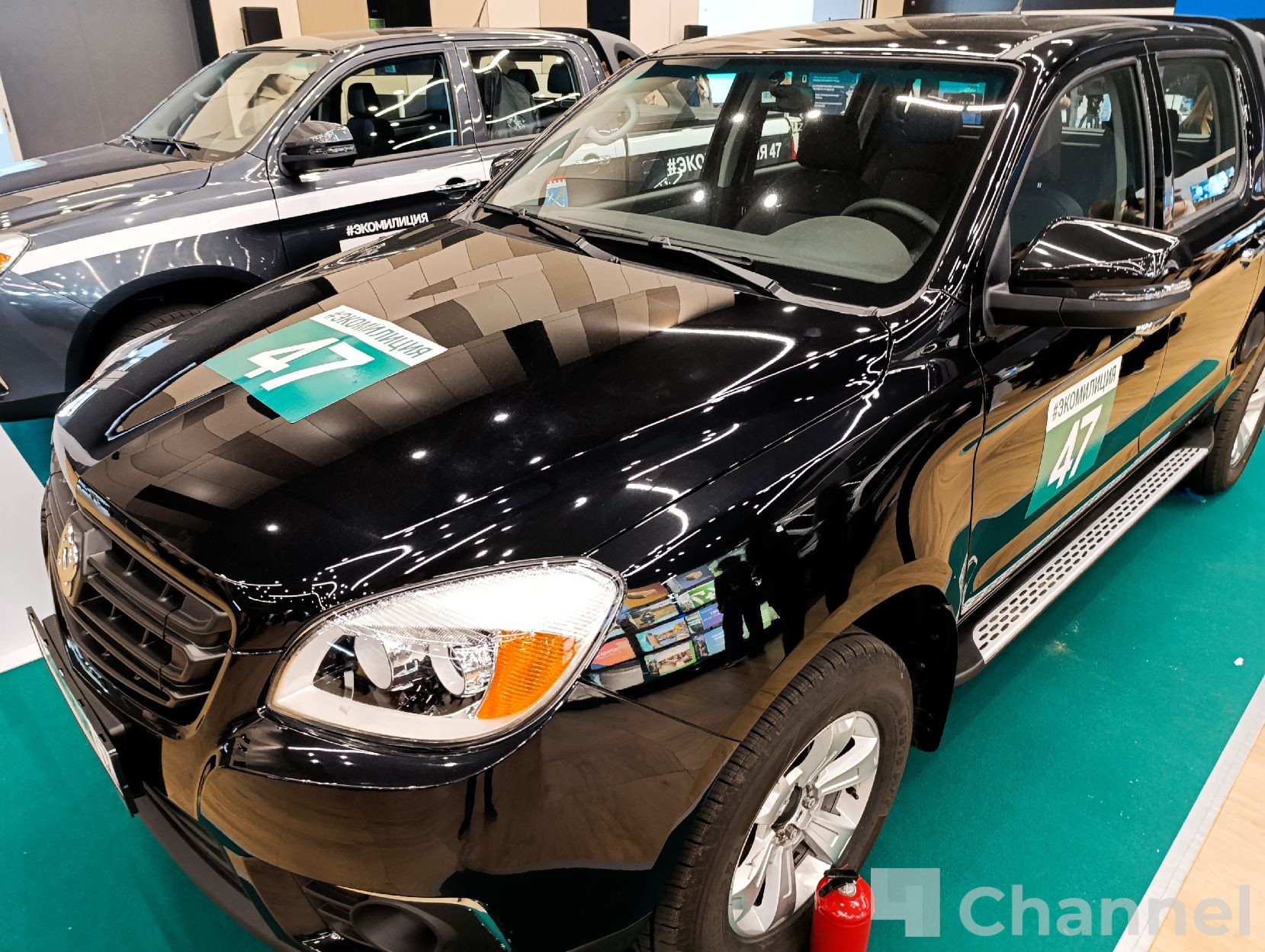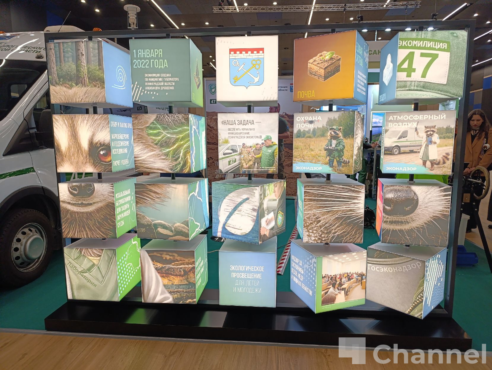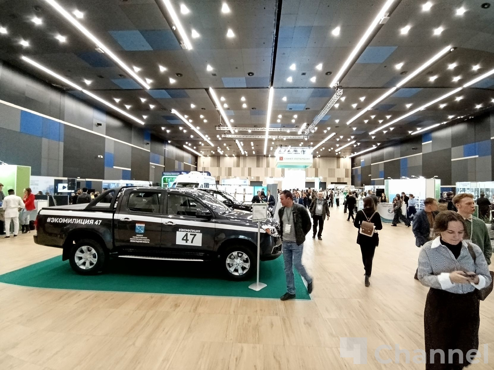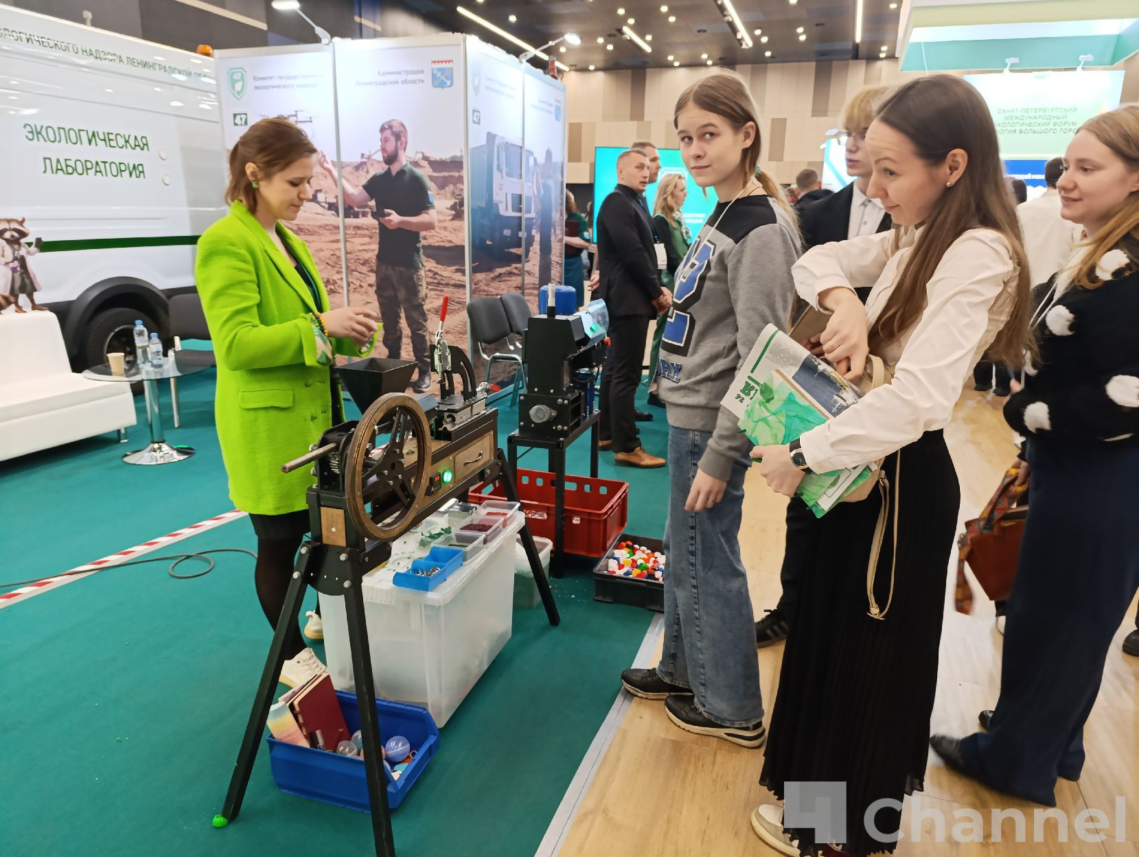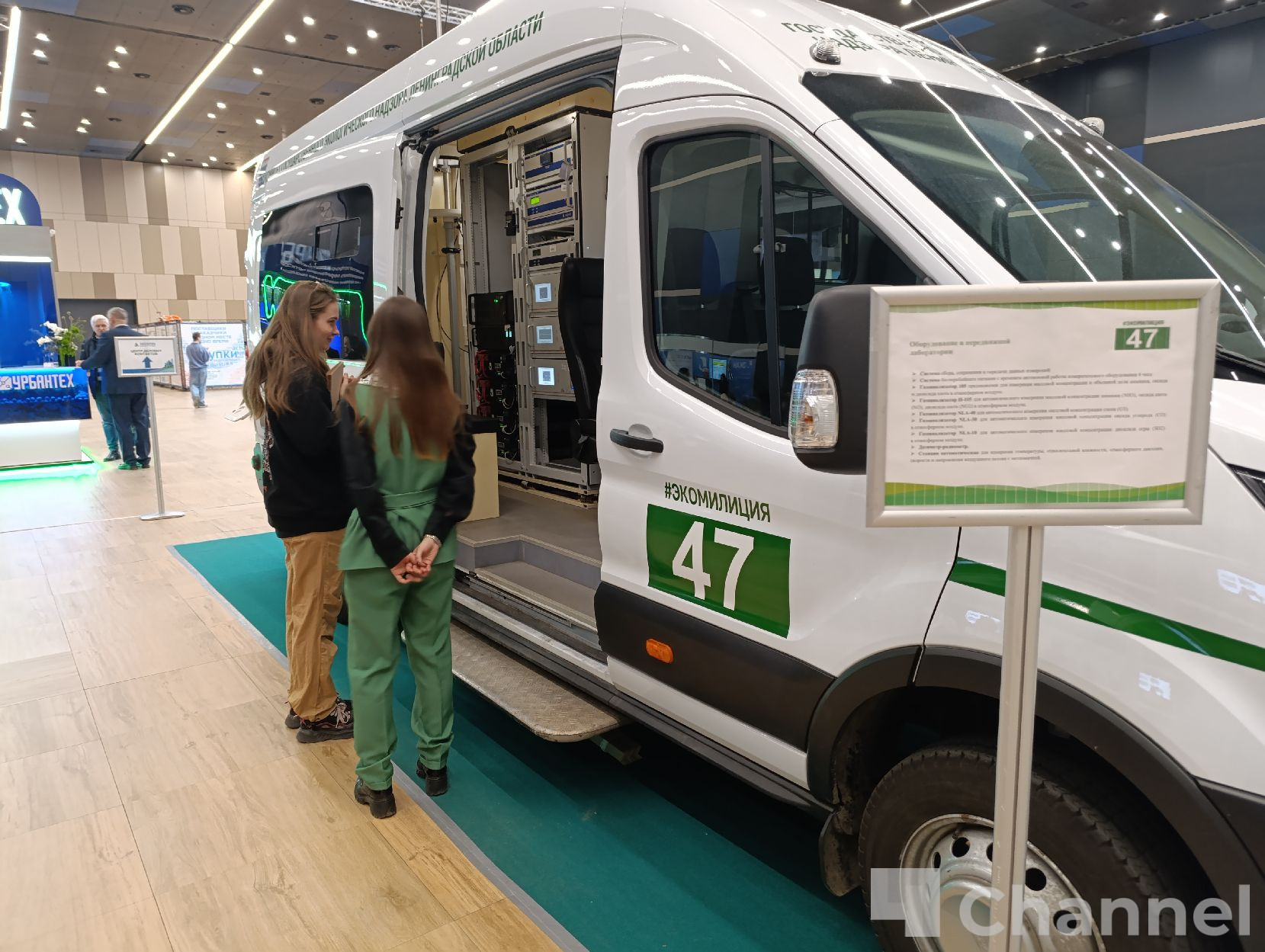 На стенде Экомилиции в "Экспофоруме" представлены специальные автомобили, устройства для переработки твердых отходов от проекта "Крышечки доброты" и микроавтобус с мобильной лабораторией.