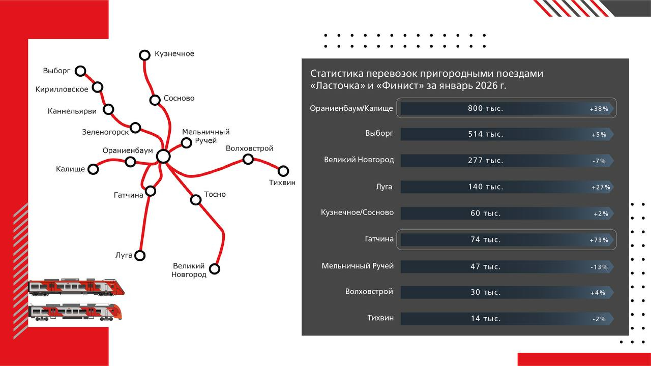 Самым востребованным направлением стал маршрут Санкт-Петербург — Ораниенбаум – Калище. Пассажиропоток в первом месяце 2026 года составил 800 тысяч человек. В тройку лидеров также вошли поездки в Выборг (514 тысяч пассажиров) и Великий Новгород (277 тысяч пассажиров).
