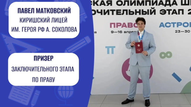 Ученик Киришского лицея им. Героя РФ А. Соколова Павел Матковский стал призером заключительного этапа Всероссийской олимпиады школьников по праву. Об этом сообщила пресс-служба комитета общего и профессионального образования Ленинградской области.