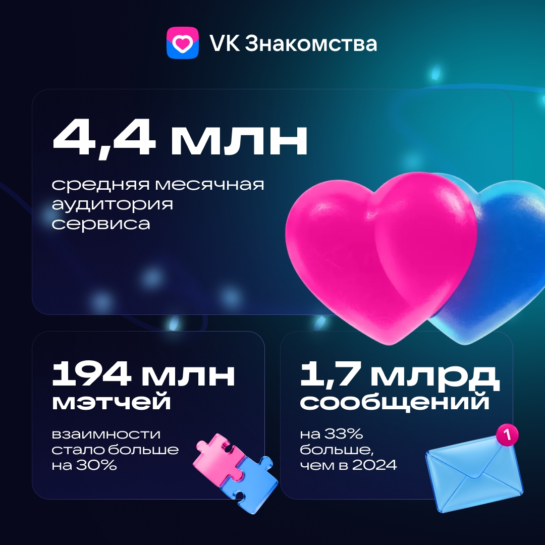 В 2025 году пользователи VK Знакомств совершили 194 млн мэтчей — на 30% больше, чем в прошлом году. Обмен сообщениями также вырос на 33% и составил 1,7 млрд сообщений. Средняя месячная аудитория за год увеличилась на 21% и достигла 4,4 млн человек.