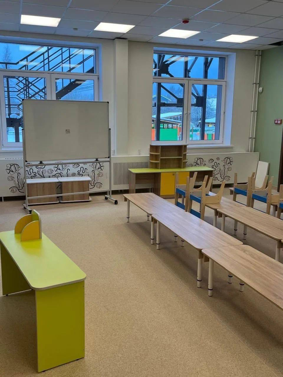 Детский сад спроектировали как удобное пространство для ребят разного возраста. В здании обустроили 12 групповых ячеек, музыкальный и физкультурный залы, кабинеты логопеда и педагога-психолога, медицинский блок и пищеблок.