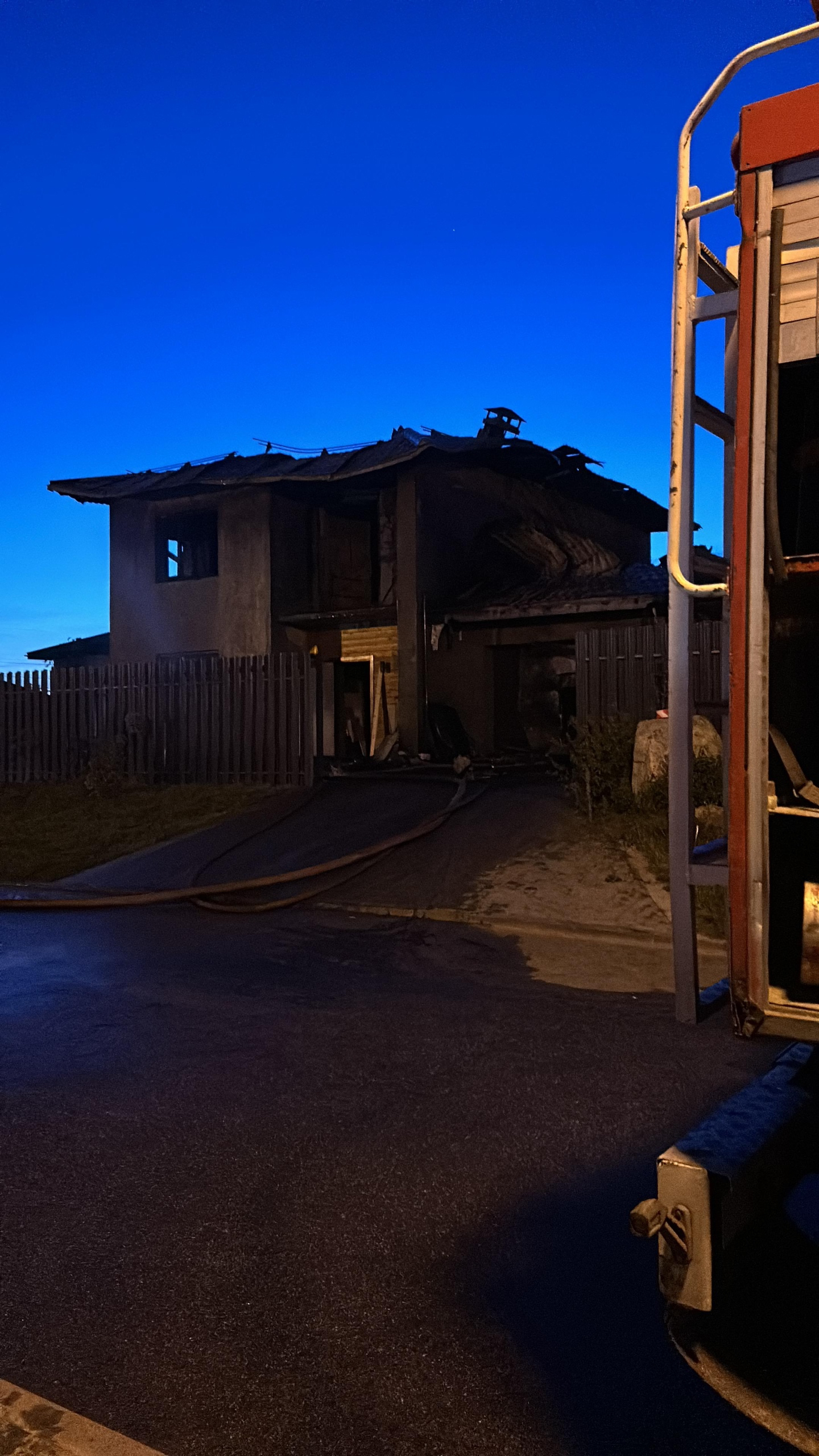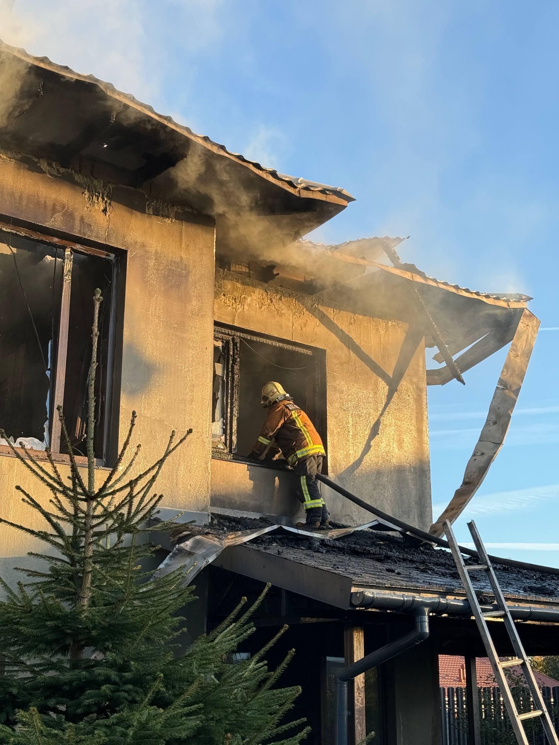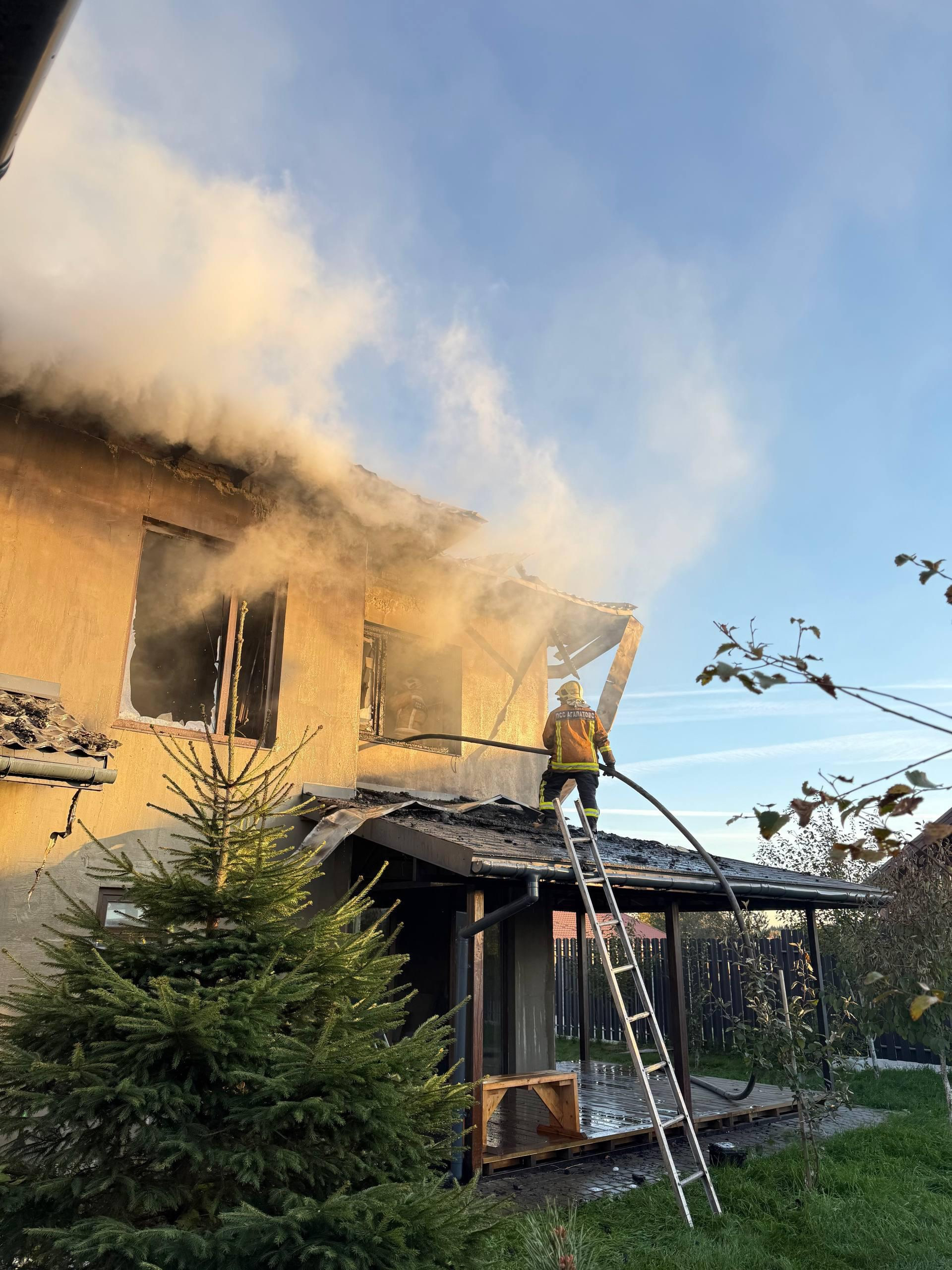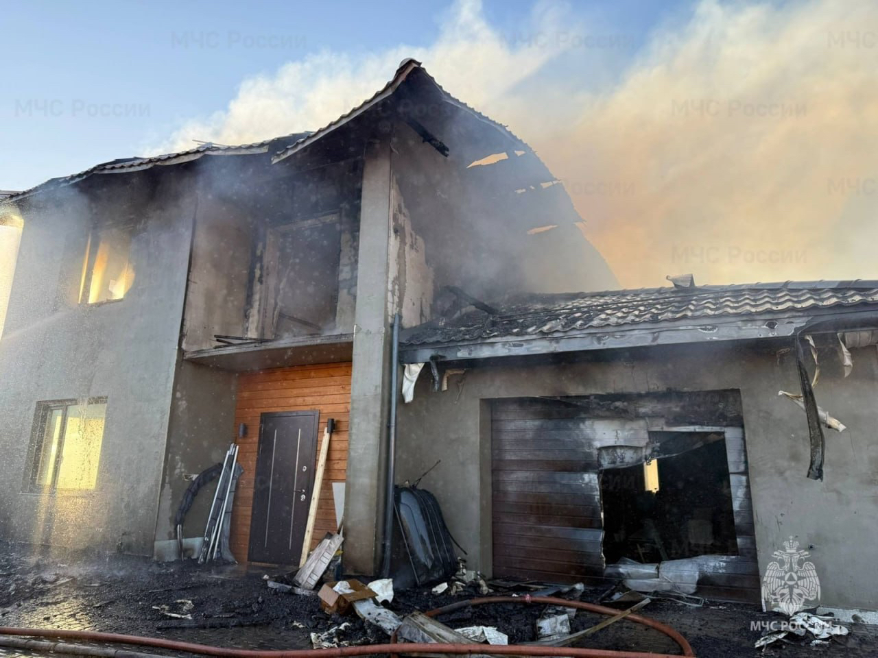 В результате пожара двухэтажный дом размером 8х10 метров выгорел изнутри. У коттеджа также обрушилась крыша. В гараже площадью 40 «квадратов» выгорела кровля.