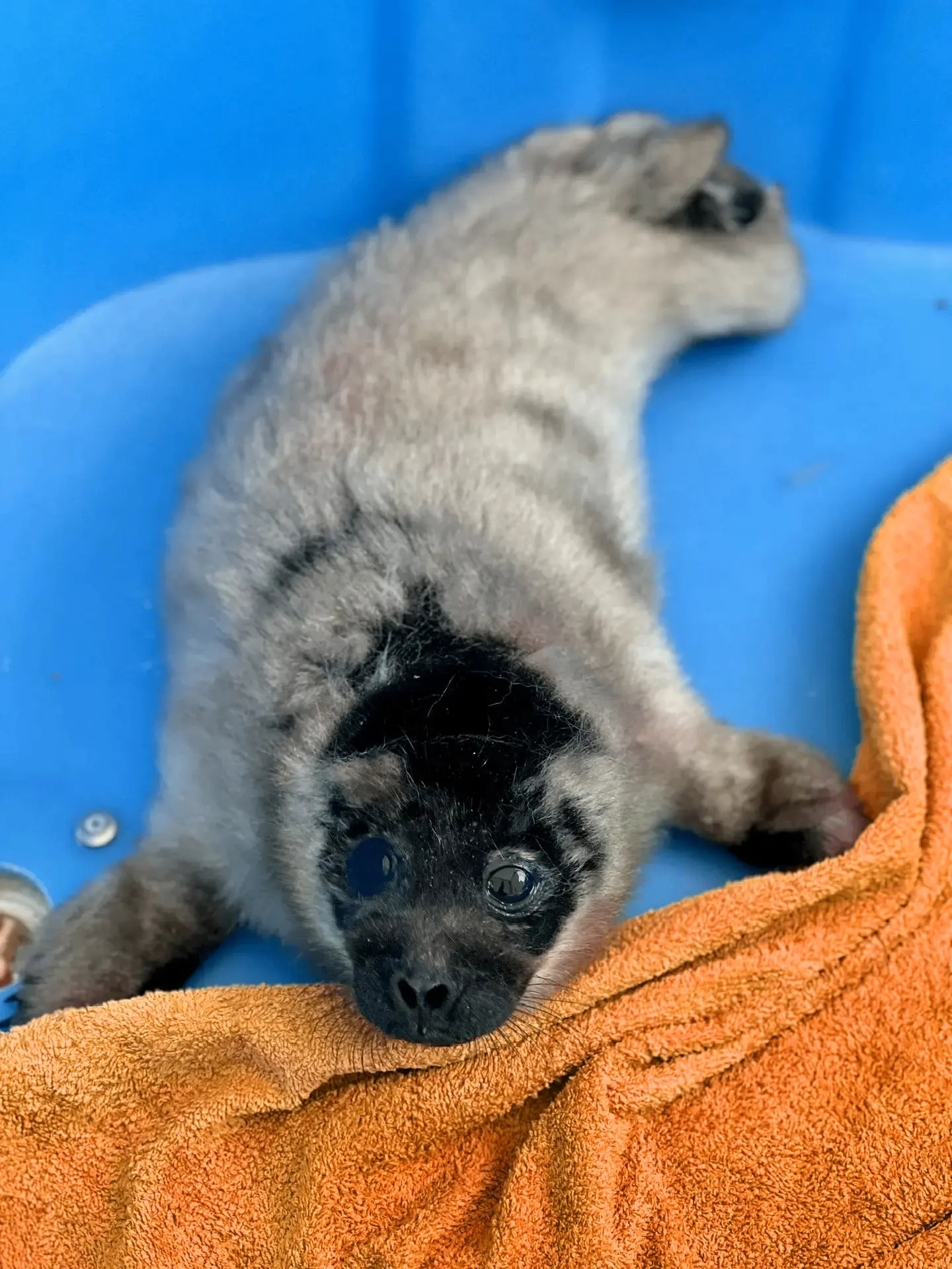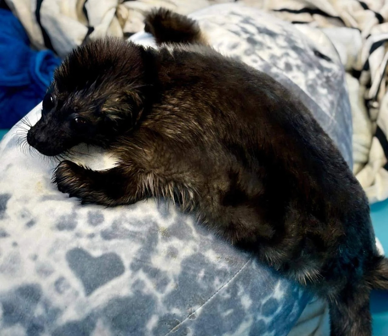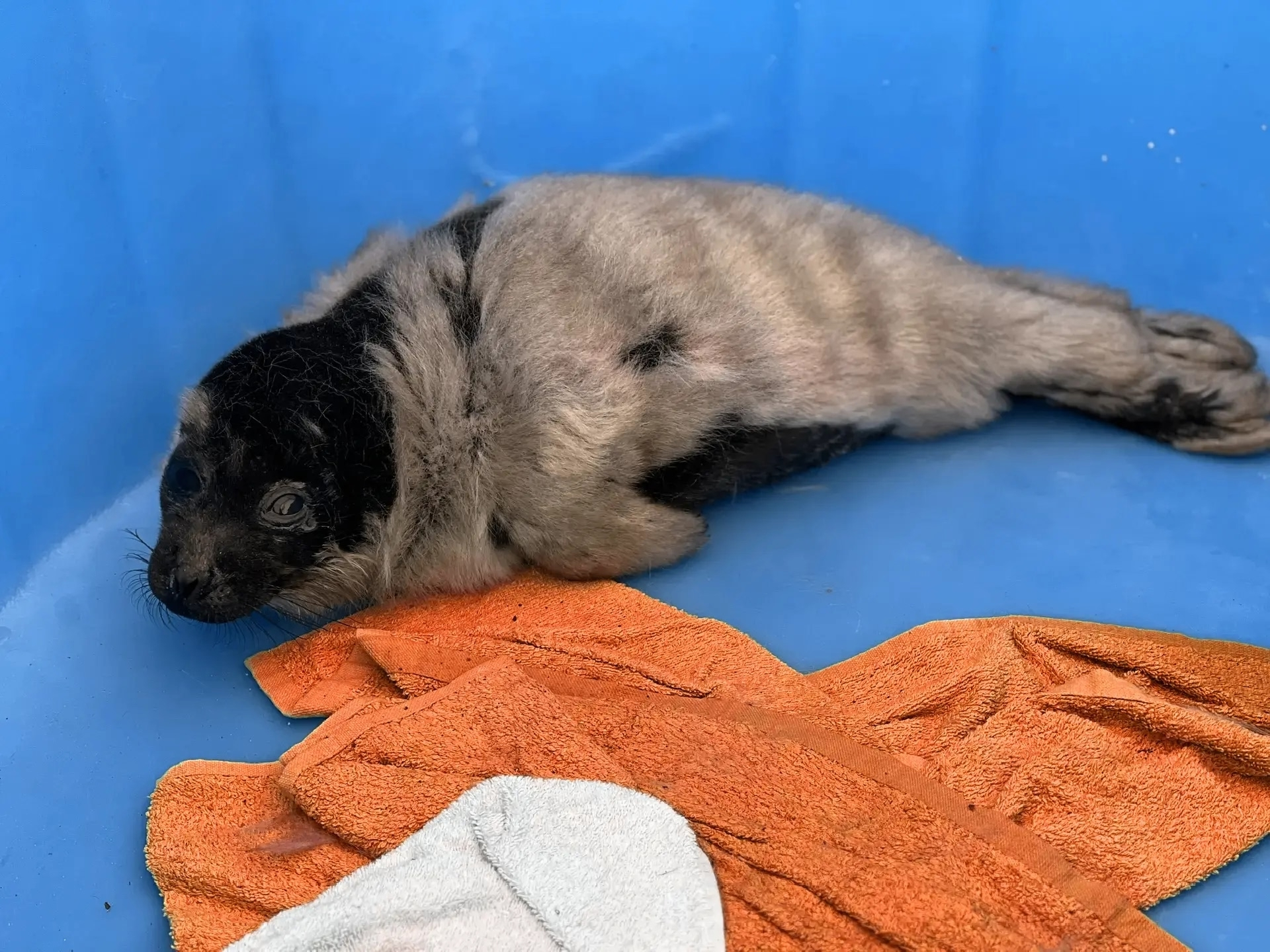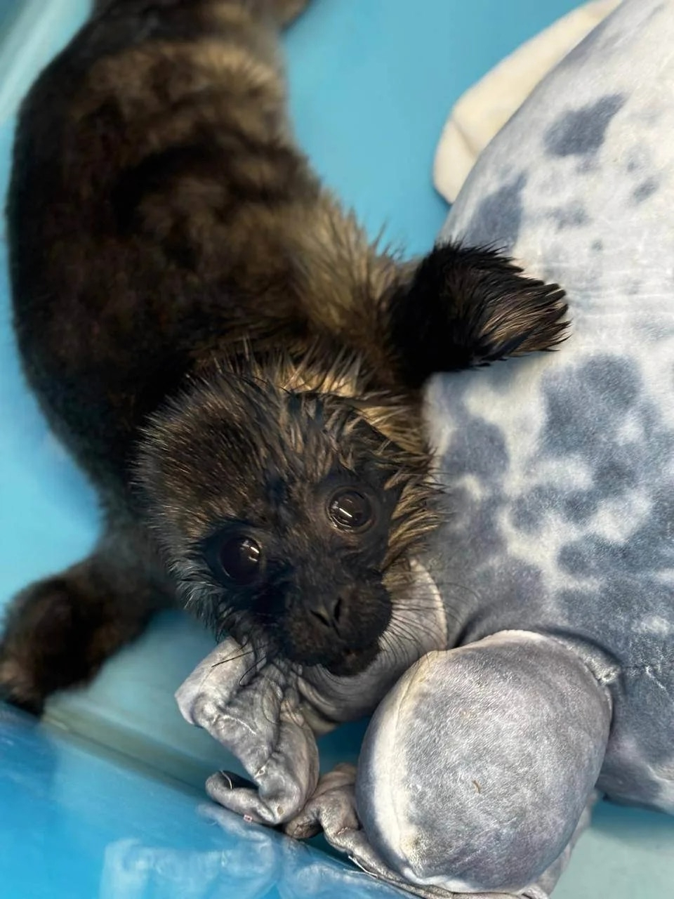 Вторую нерпу обнаружили в окрестностях Кильпола. Малышка ползала под дождем по берегу. Судя по свежей пуповине, она родилась за день до встречи с людьми, сразу потеряла связь с матерью и сильно переохладилась из-за осадков.