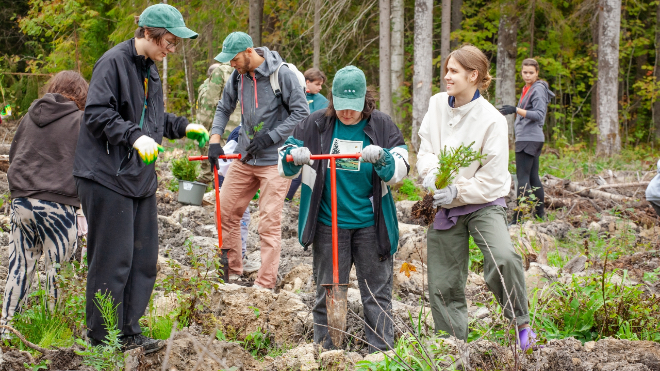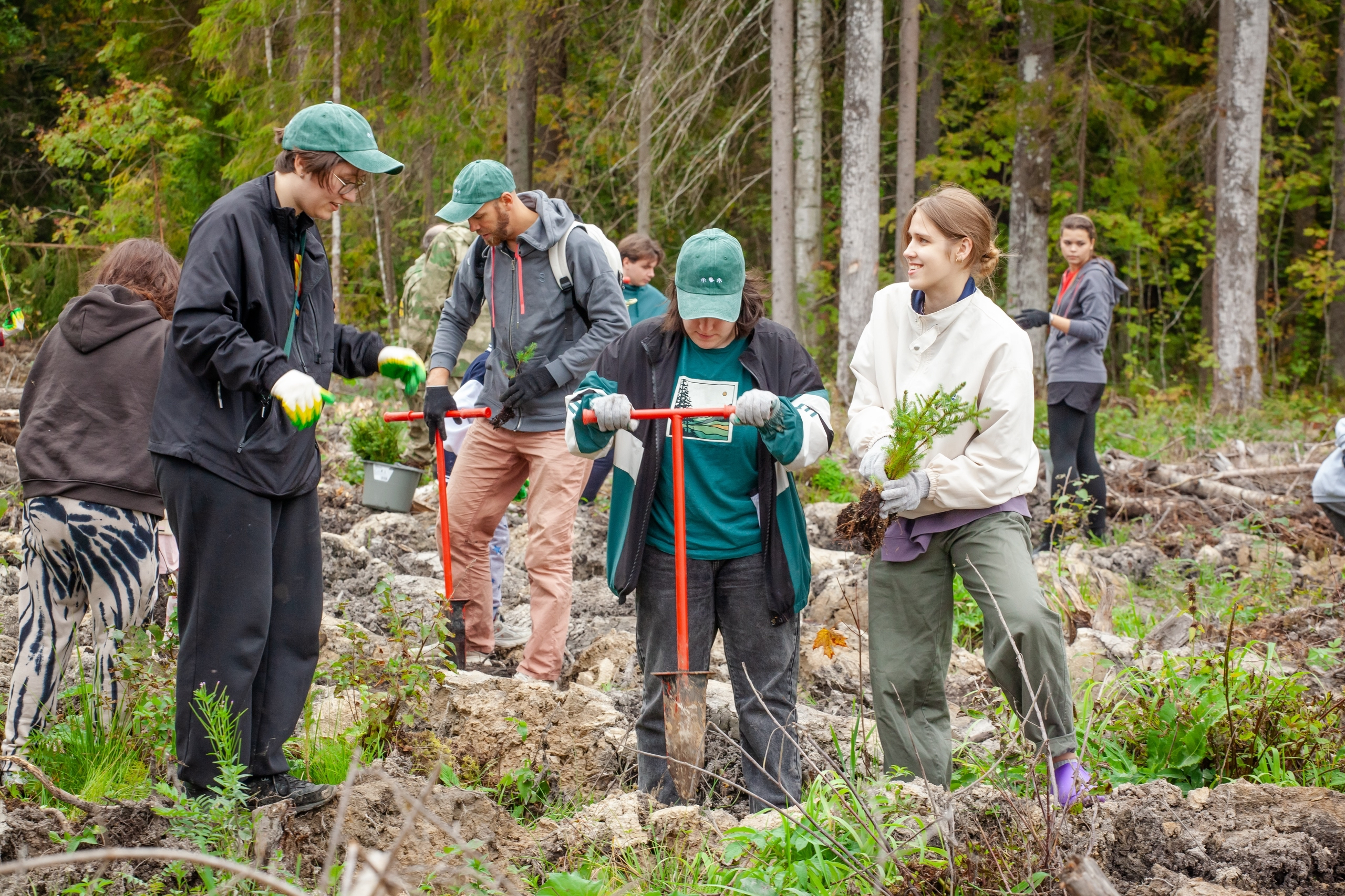 Для волонтеров провели ознакомительный инструктаж. После этого они разделились на команды по три человека. Каждая группа получила по 200 саженцев и мечи Колесова для посадки. Волонтеры быстро включились в работу.