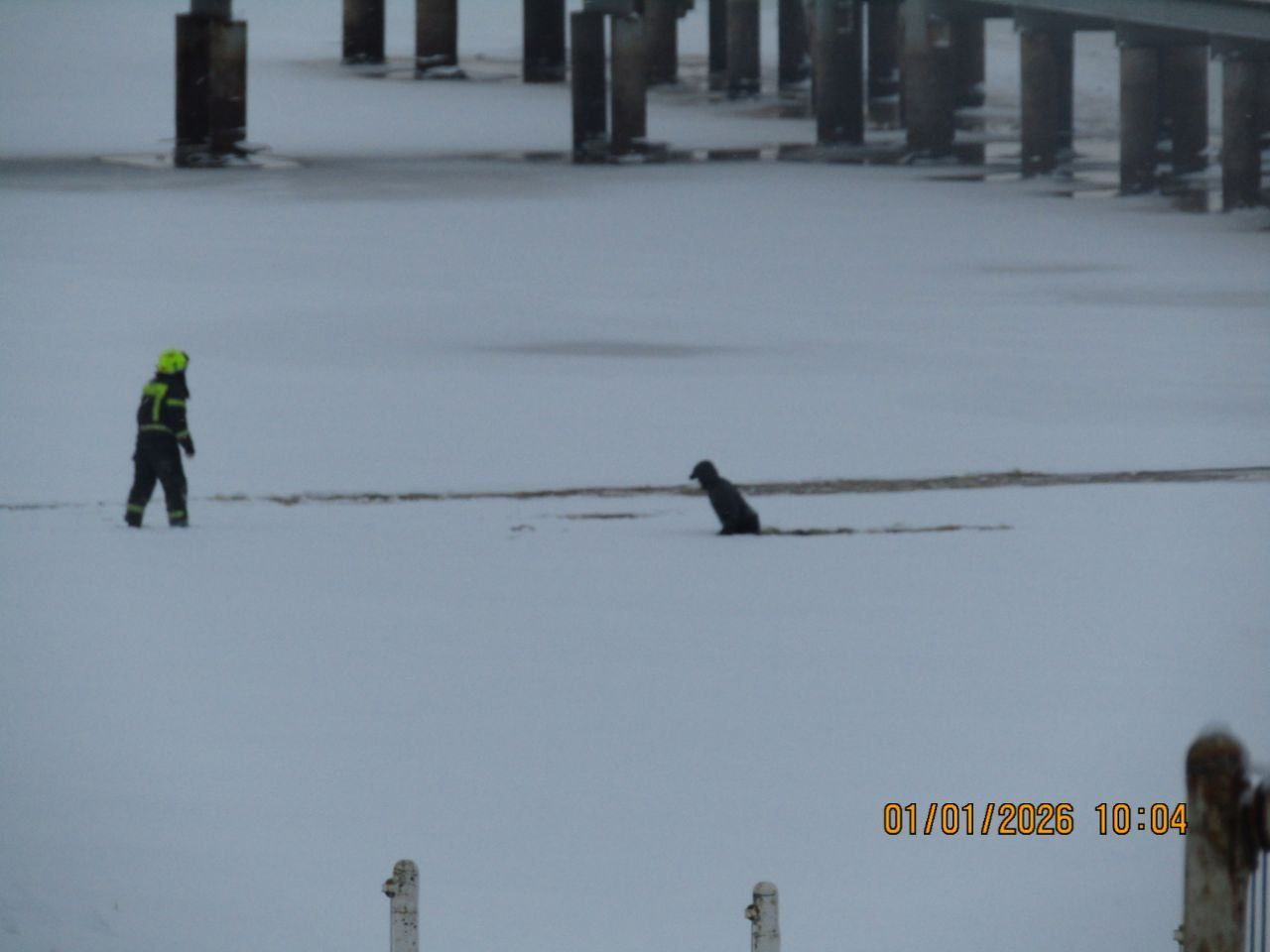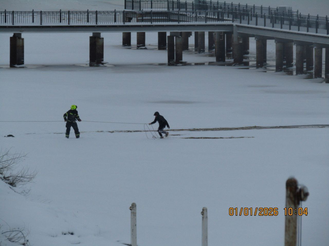 На глазах у пожарных полицейский тоже провалился под лёд, но его быстро вытащили с помощью лестницы и верёвки. Затем под лёд ушёл и первый мужчина, пытаясь добраться до берега, — его тоже спасли.