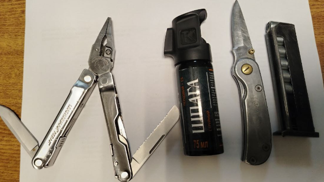 В Кировске судебные приставы изъяли у посетителя запрещённые предметы во время заседания суда. 48-летний мужчина пришёл на слушание в качестве свидетеля и по просьбе сотрудника Кировского районного отделения приставов выложил содержимое сумки на стол. Оказалось, что он принёс травматический пистолет с патронами калибра 45, нож, газовый перцовый баллончик и мультитул с пассатижами, отверткой и ножницами.