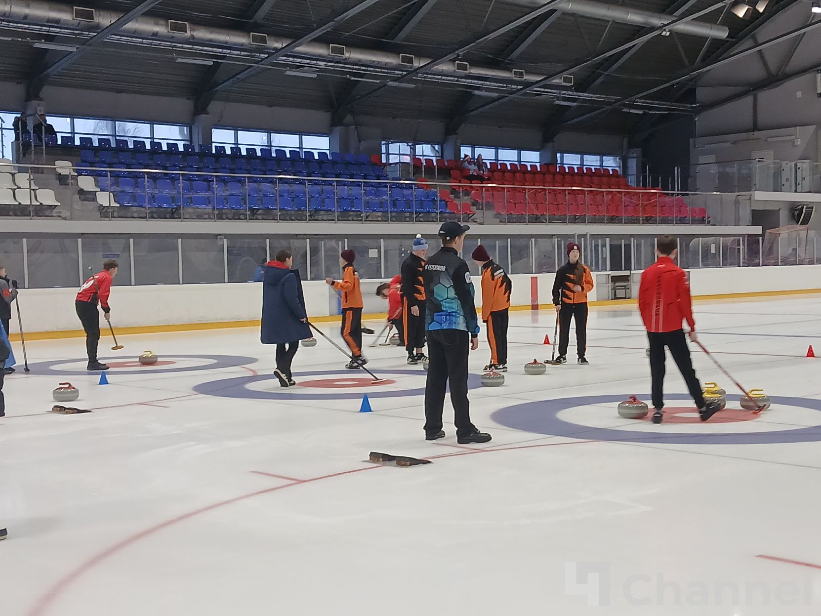 В Колтушах в спортивном комплексе "Ладога Арена" во вторник, 10 февраля, проходит второй день соревнований по керлингу в рамках первых спортивных игр святого благоверного Александра Невского. Перед началом матчей команды проводят разминку.