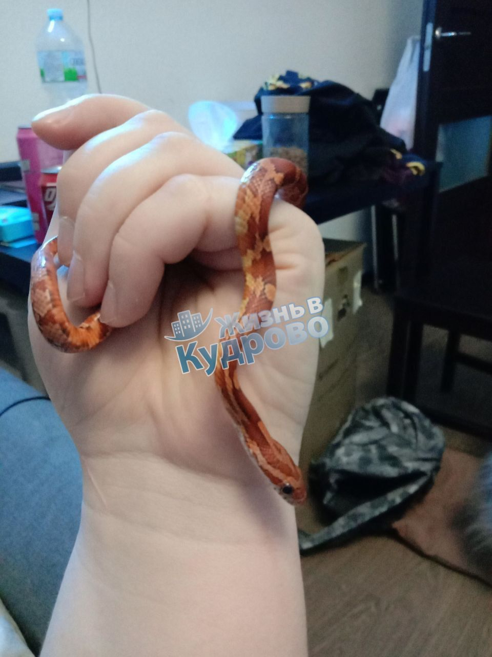 Красно-оранжевый со светлыми пятнами детеныш маисового полоза удрал из террариума через щель, когда виниловые стенки деформировались. Это случилось в доме 3к2 по Английской улице в городе Кудрово. Змейка безобидна и помещается в руке. Если кто-то повстречает малыша, просьба сообщить о находке в Телеграм-канал.
