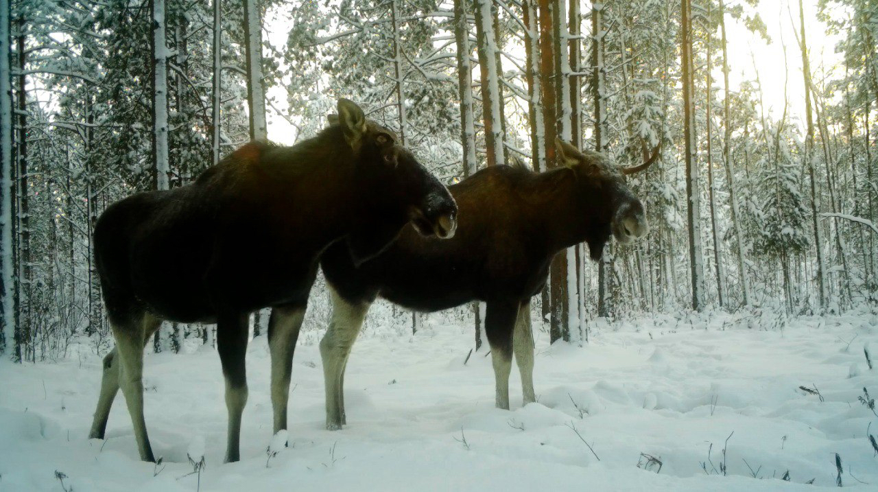 Лоси постоянно общаются между собой, используя для этого разнообразные звуки. Почти все сохатые, попавшие в объектив видеоловушки, уже сбросили рога. Грозное оружие осталось лишь у одного самца. Однако и у него рог отпадет со дня на день.