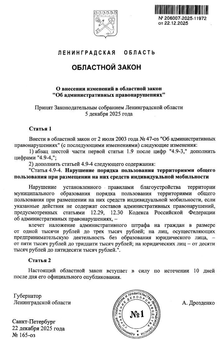 С января 2026 года в Ленинградской области начали действовать новые правила использования средств индивидуальной мобильности (СИМ). К ним относятся электросамокаты, гироскутеры, сигвеи и др. Теперь за нарушение местных норм благоустройства можно получить штраф.