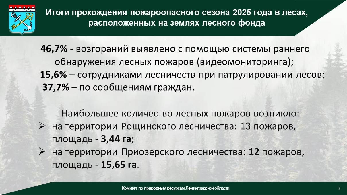 В четверг, 27 ноября, на заседании правительства Ленинградской области подвели итоги пожароопасного сезона в 2025 году. Число лесных пожаров и общая площадь возгораний значительно снизились.