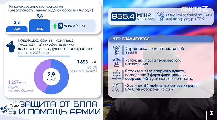 По словам главы 47 региона, в 2025 году на защиту воздушного пространства 47 региона, поддержку добровольческих формирований и помощь воинским частям в зоне СВО было направлено более 24 миллиардов рублей. Это - значительная нагрузка на бюджет. 47 регион продолжает действовать под лозунгом "Все для фронта, все для победы".