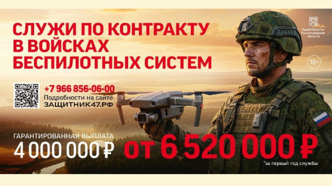 С 24 февраля в Ленинградской области увеличена до 4 миллионов рублей гарантированная выплата для граждан, заключивших контракт для поступления на военную службу в Войска беспилотных систем ВС РФ.