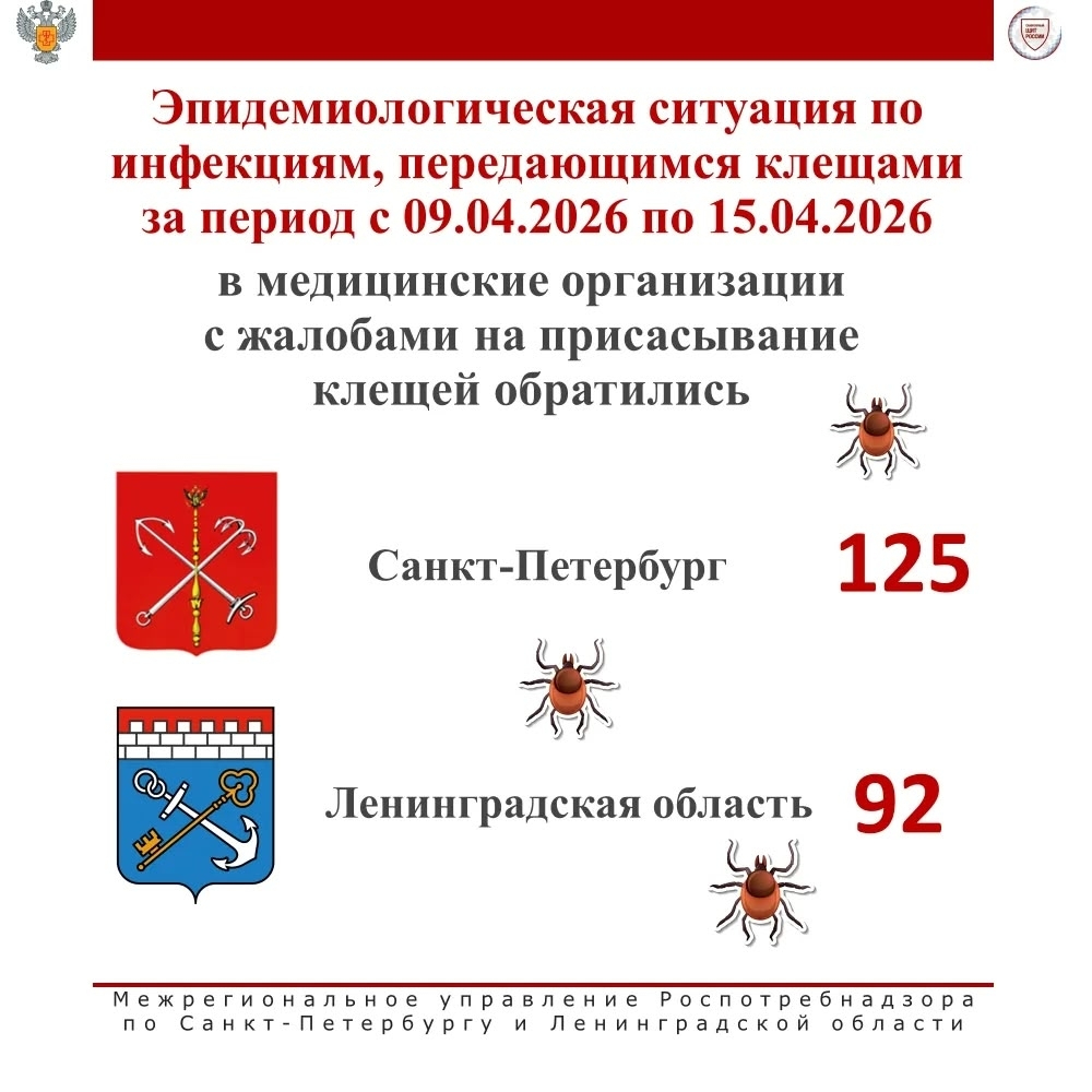 Межрегиональное управление Роспотребнадзора по Санкт-Петербургу и Ленинградской области продолжает мониторинг активности клещей. С 9 по 15 апреля в 47 регионе в медицинские учреждения по поводу присасывания клещей обратились 92 человека, в том числе - 28 детей.
