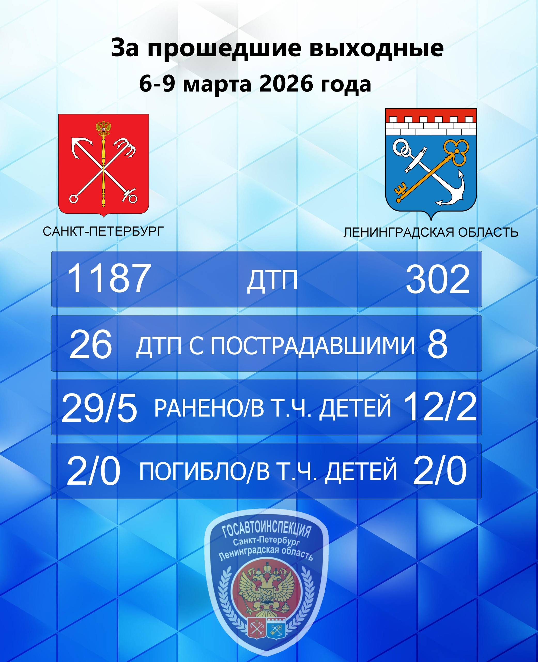 Во вторник, 10 марта, Госавтоинспекция по Санкт-Петербургу и Ленинградской области опубликовала статистику происшествий за праздничные выходные. Суммарно в двух субъектах произошло почти 1500 аварий, погибли четыре взрослых.
