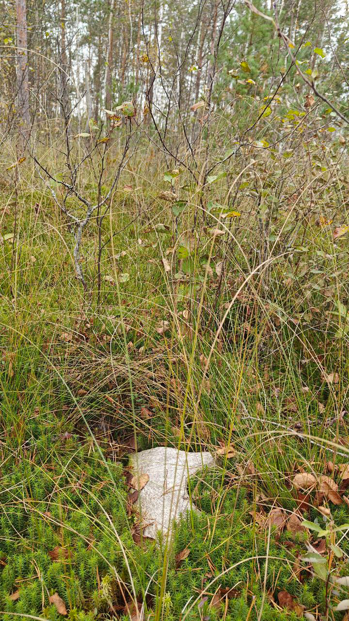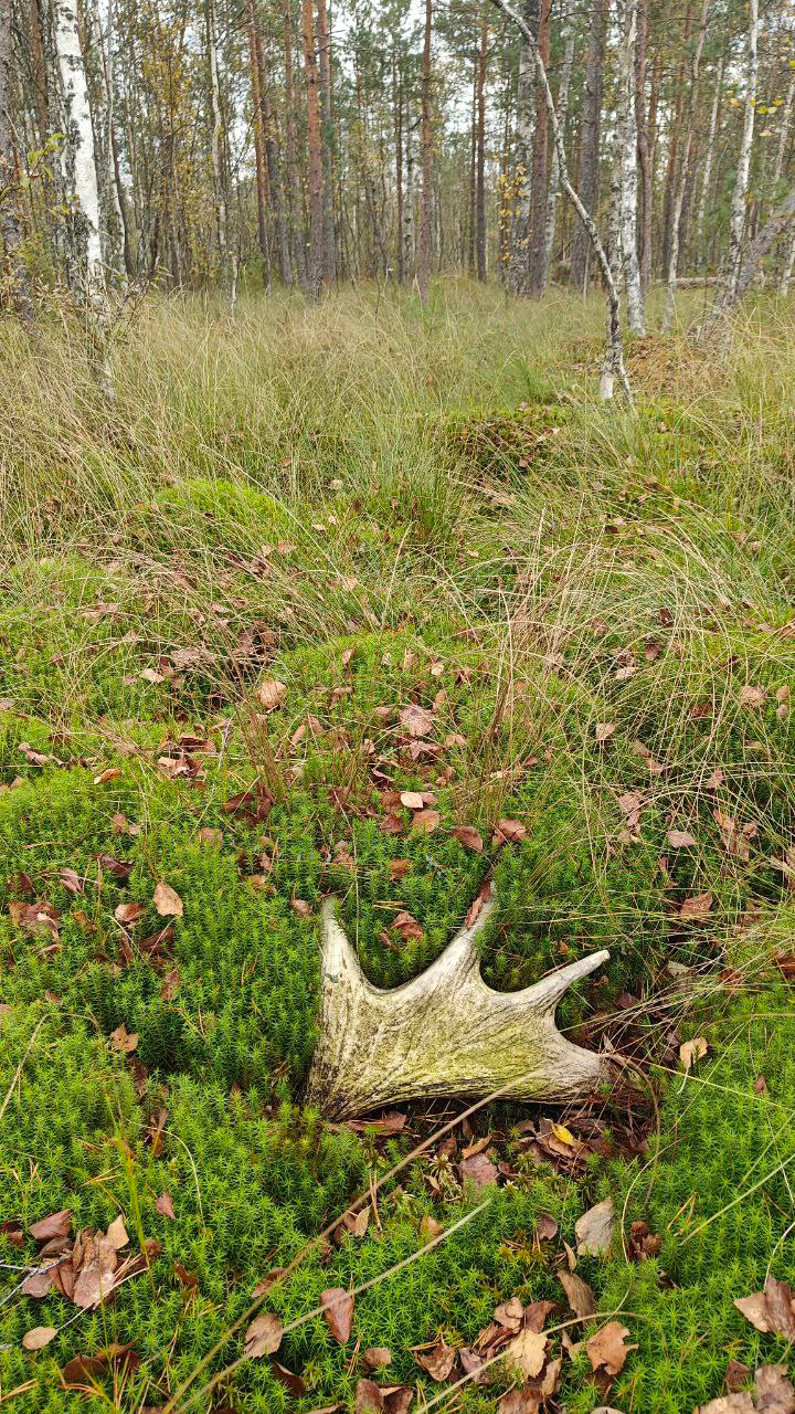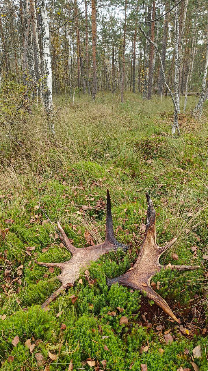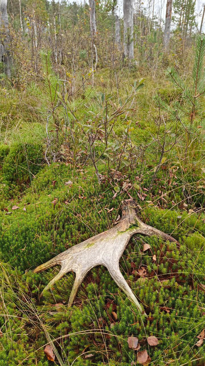 Верхняя сторона рога выцвела и побелела в результате воздействия солнца. Светлое пятно от рогов сейчас хорошо заметно на фоне пожелтевшей травы и мха. При этом найденные рога отличаются по размеру - значит, принадлежали разным лосям.