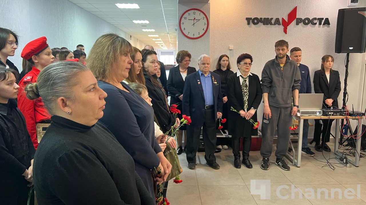 Во время торжественной церемонии на большой перемене знаменная группа вынесла флаги России и Ленинградской области. Память погибших почтили минутой молчания и возложением цветов.