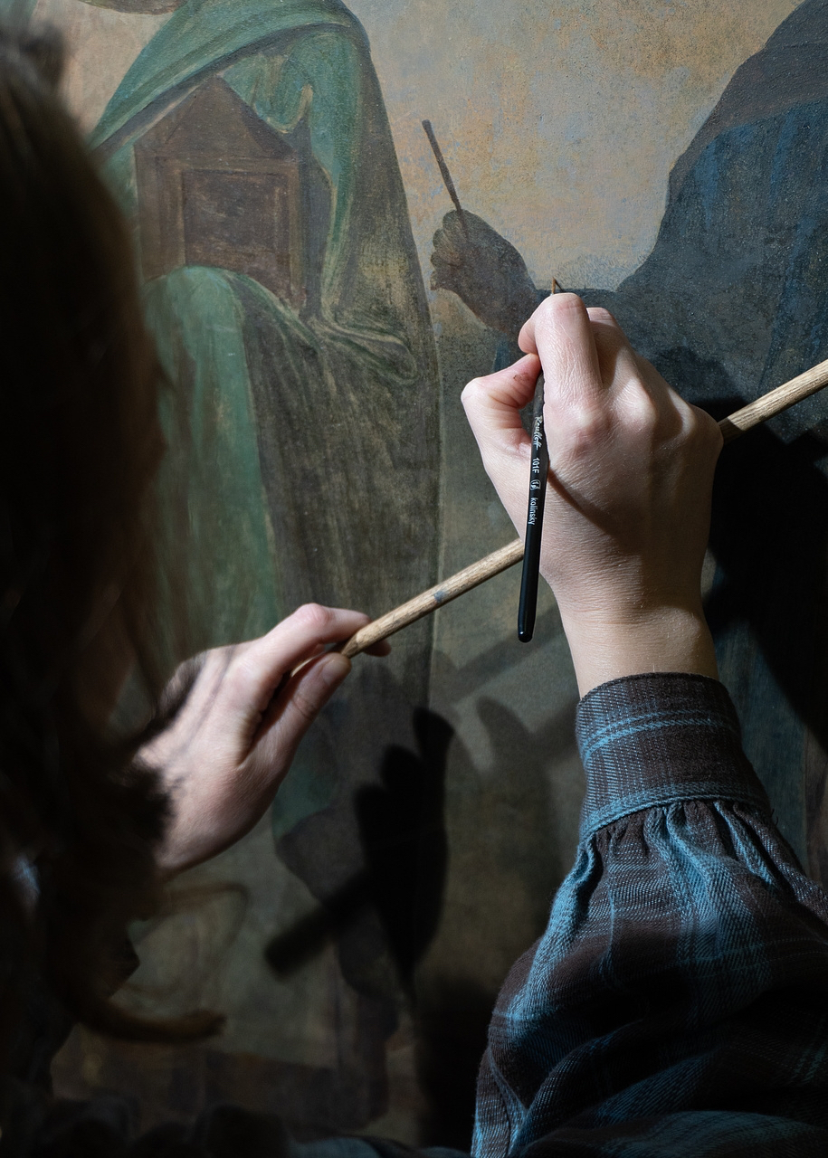 В конце 2023 года фасадная икона на цинковой пластине поступила в мастерскую реставрации смешанных техник. Специалистам предстояло вернуть образу визуальную целостность. Ключевым этапом работ стала разработка специальной методики укрепления и очистки масляной живописи.