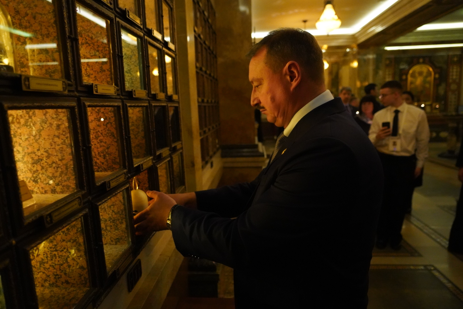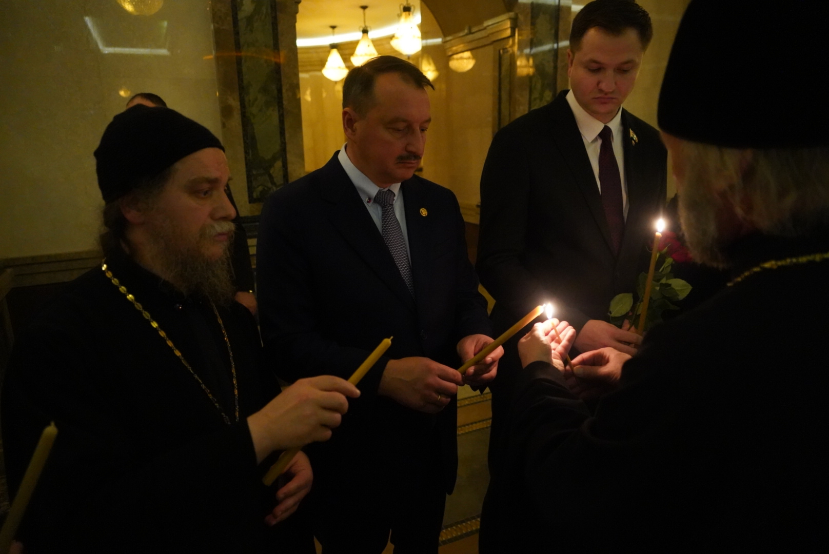 Церемонию провел руководитель национального мемориального комплекса «Храм-памятник в честь Всех Святых и в память о жертвах, спасению Отечества нашего послуживших», протоирей Федор Повный. Как рассказали в пресс-службе Леноблизбиркома, крипта минского собора - уникальный объект, аналогов которому нет во всем мире.