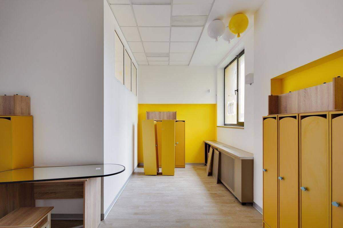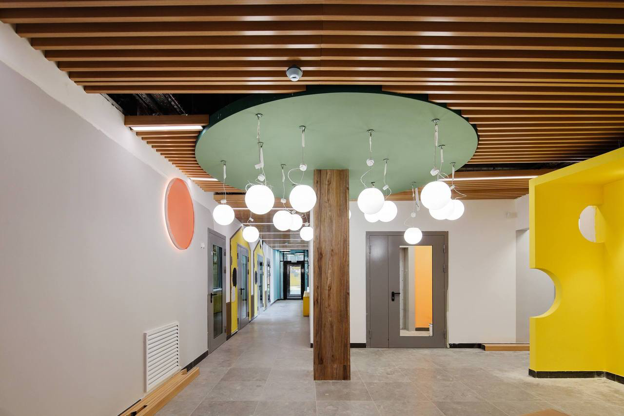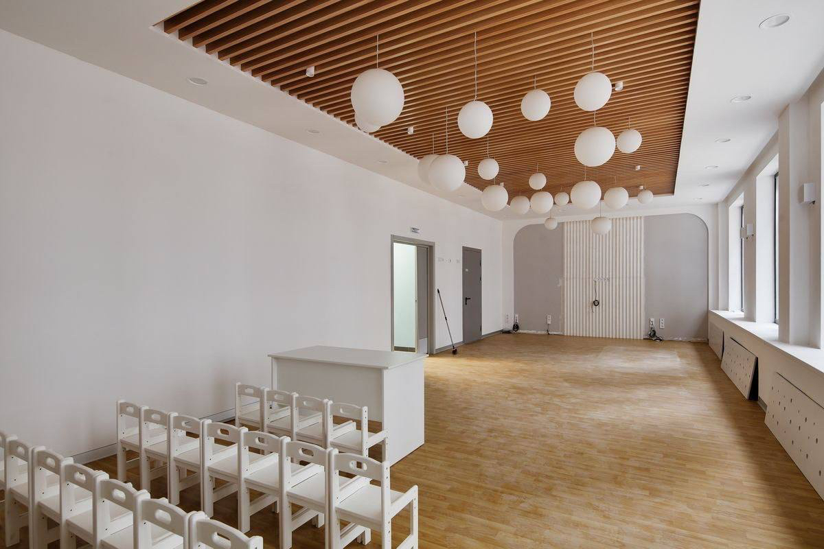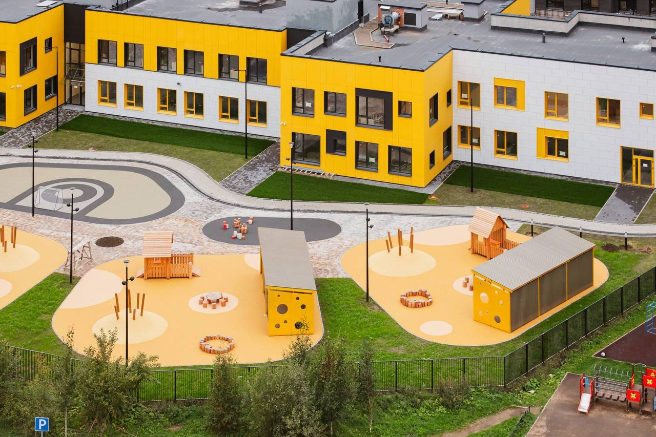 В детском саду предусмотрели музыкальный и физкультурный залы, просторные групповые комнаты, современную кухню, помещения для сна и творчества. На территории спроектировали игровые площадки с мягкими линиями и островками для разных видов активности.