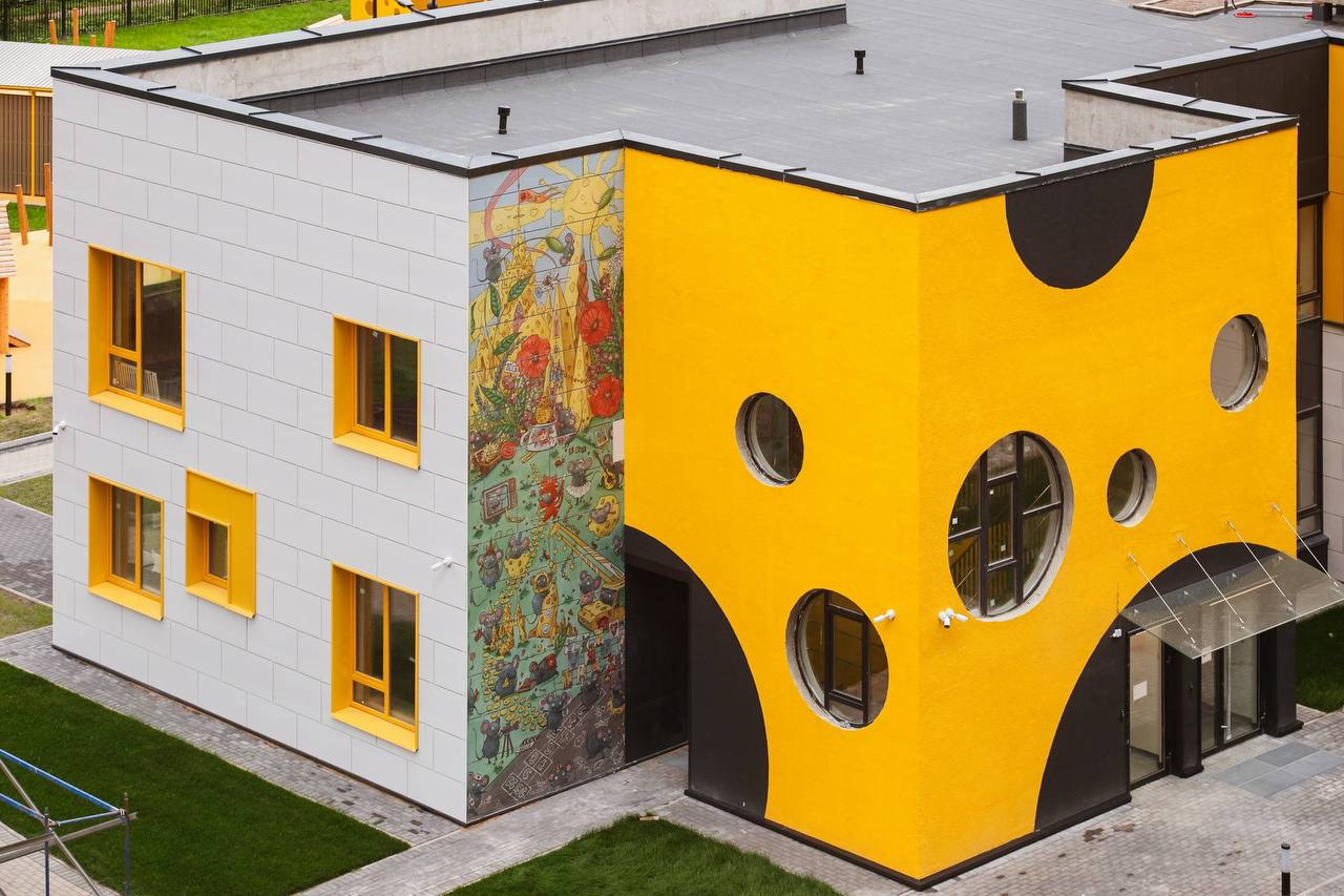 Фасад здания украсило девятиметровое панно из керамогранитных плит с изображением «сырного города» и его обитателей. Тематическое оформление продолжили внутри детского сада - в нем появилась мебель с «сырными отверстиями», круглые окна и необычные элементы декора.