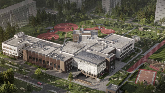 В школе оборудуют творческие и инженерные мастерские, медиастудии и лаборатории для практических занятий. В спортивной зоне появятся большой зал, помещения для хореографии и борьбы, футбольное поле и беговые дорожки. Территорию разделят по возрастным зонам, а более 70% участка займет озеленение — во дворах создадут теневые маршруты и зоны отдыха.