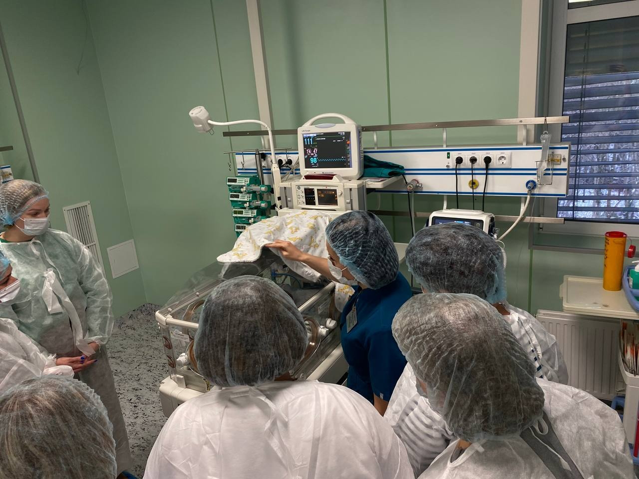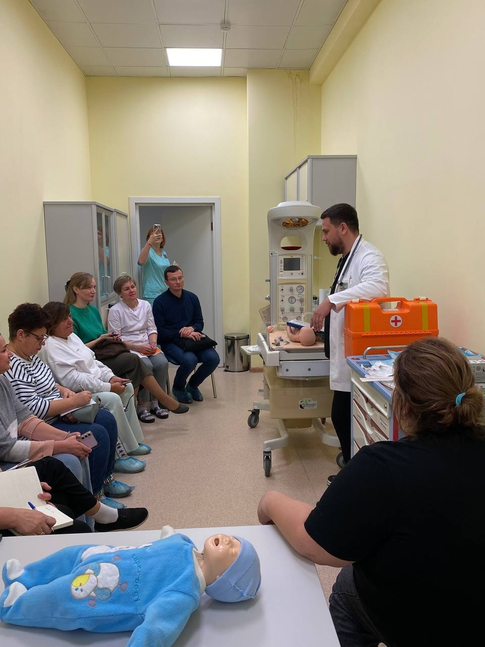 На специальном манекене фельдшеры отработали алгоритмы действий в критических ситуациях. Для сотрудников СМП также организовали экскурсию по отделениям Перинатального центра.