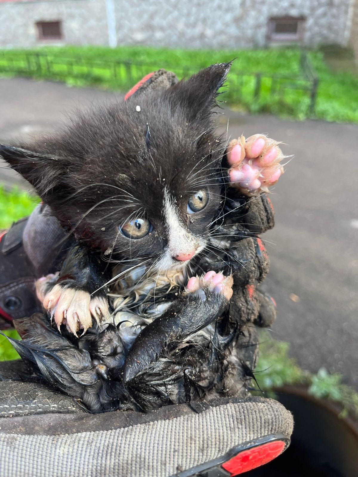 В Петербурге из пахучей канализации спасли котенка-замарашку