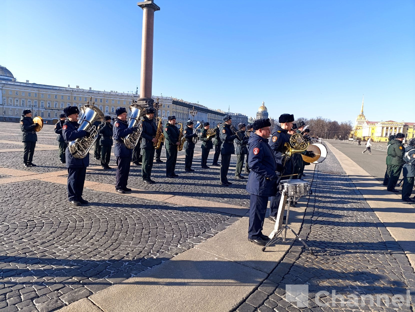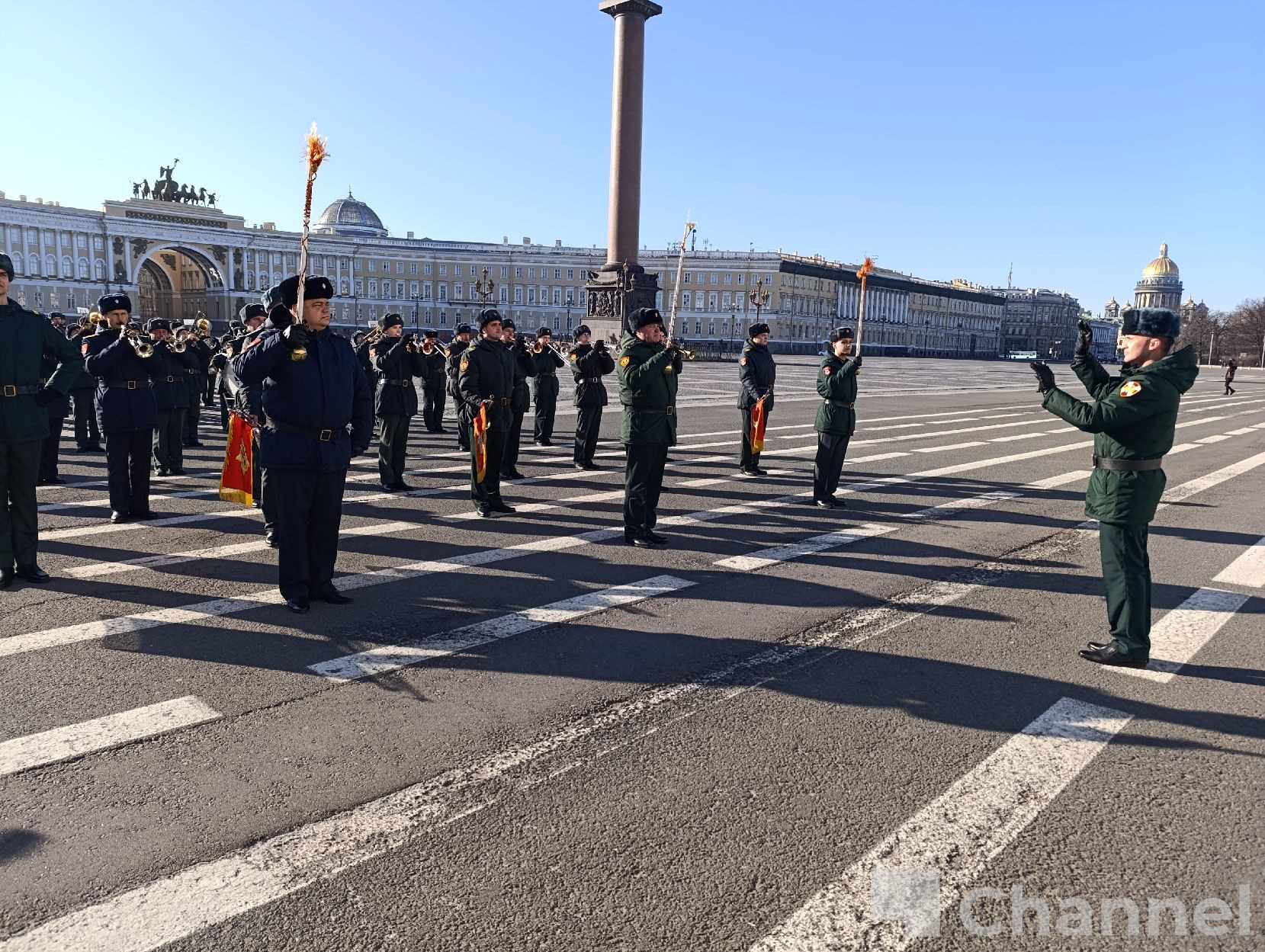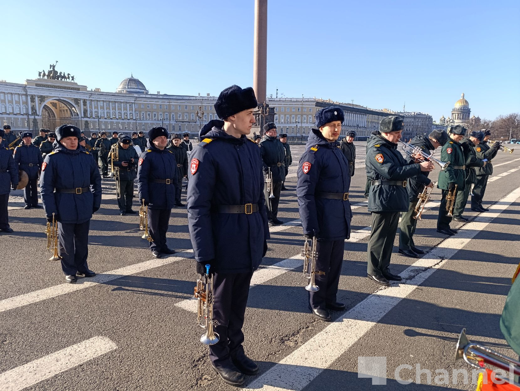 В Санкт-Петербурге на Дворцовой площади прошла первая репетиция сводного военного оркестра гарнизона к параду, посвященному 81-й годовщине Победы в Великой Отечественной войне.