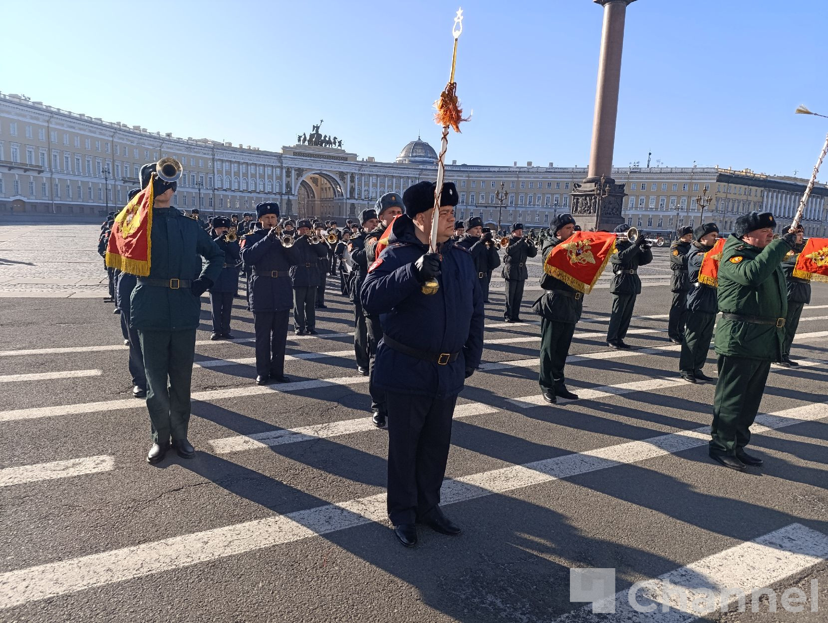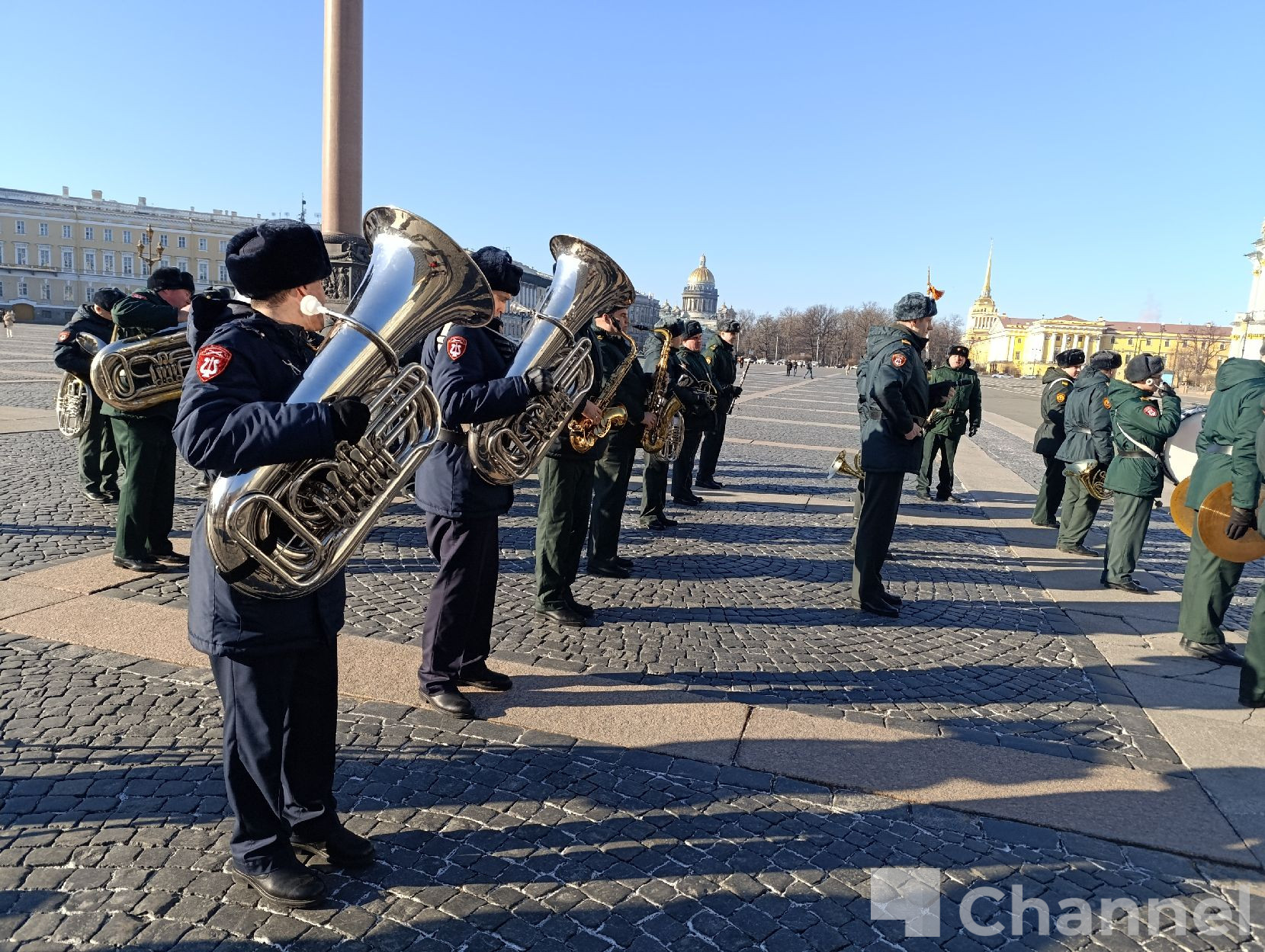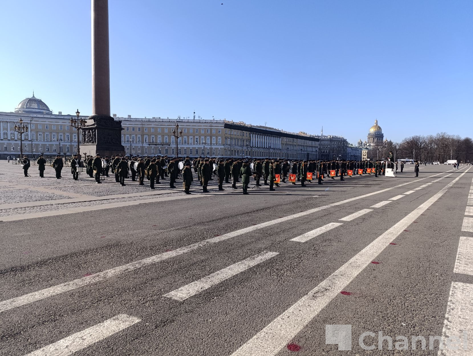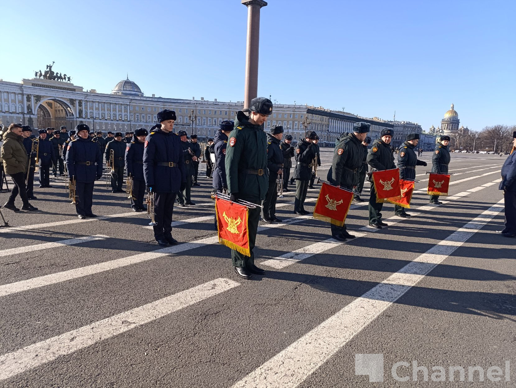 В Санкт-Петербурге на Дворцовой площади прошла первая репетиция сводного военного оркестра гарнизона к параду, посвященному 81-й годовщине Победы в Великой Отечественной войне.