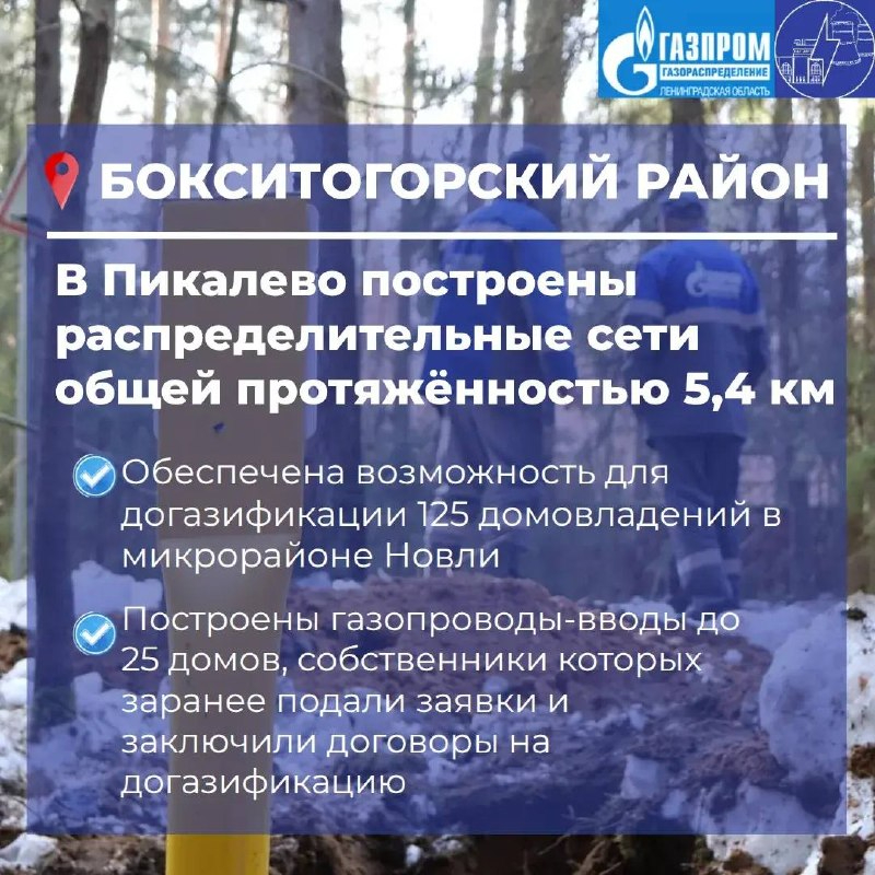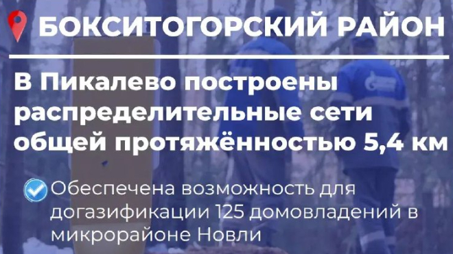 В микрорайоне Новли (Пикалево, Бокситогорский район) завершили строительство распределительных газовых сетей общей протяженностью 5,4 километров. Это позволило подключить к газу 125 домовладений, которые теперь могут пройти догазификацию.