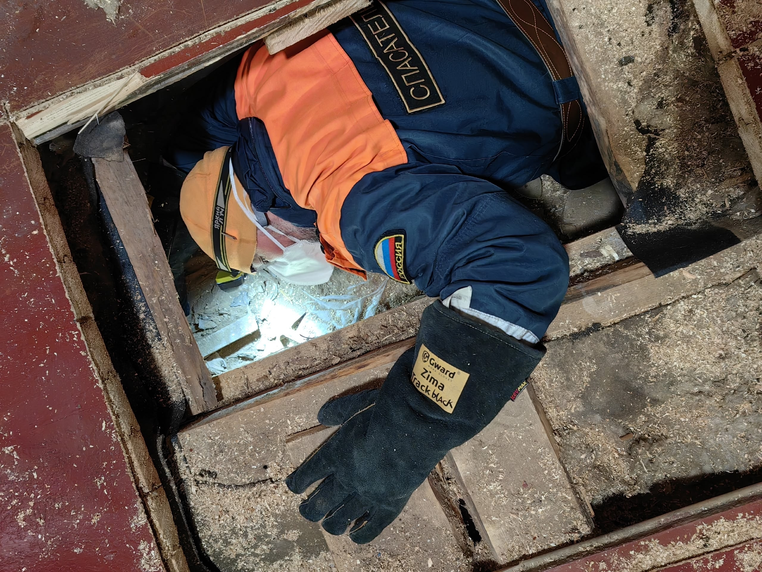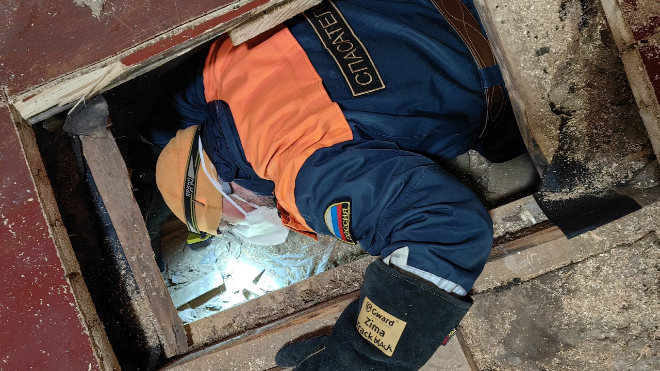 Добровольцы Саша и Арина в конце рабочего дня отправились в путь из Санкт-Петербурга. За несколько часов в пути они преодолели 380 километров и пересекли на пароме реку Свирь. Добравшись до дома заявительницы, спасатели выяснили, что достать собаку через продух невозможно.