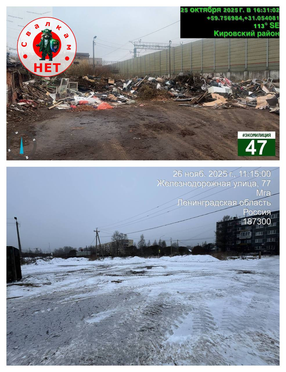 В конце октября 2025 года инспекторы Комитета госэконадзора Ленинградской области обнаружили в поселке Мга (Кировский район) крупную свалку - строительный мусор, старую мебель, покрышки и многое другое. Ее объем составлял около 400 кубометров.